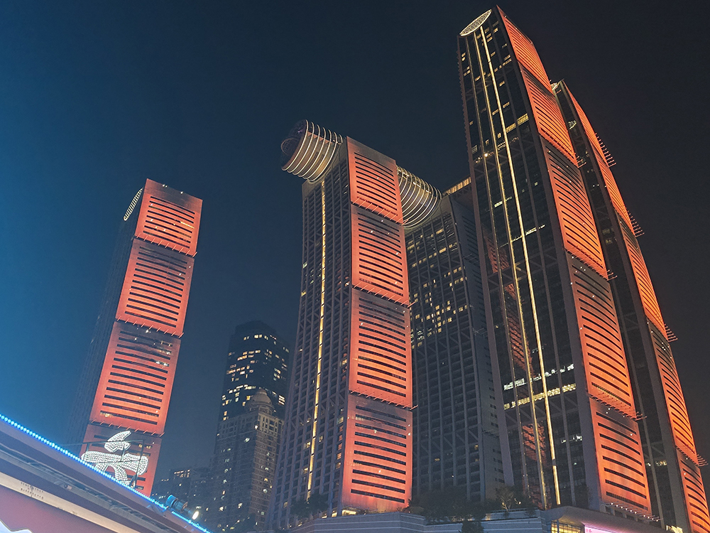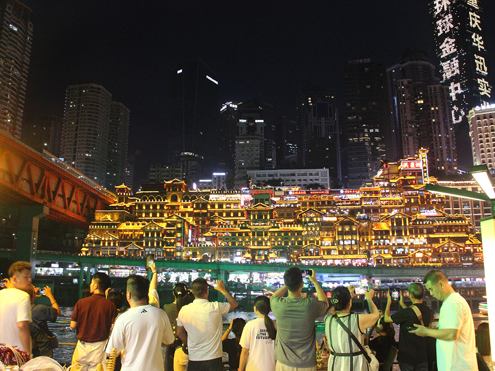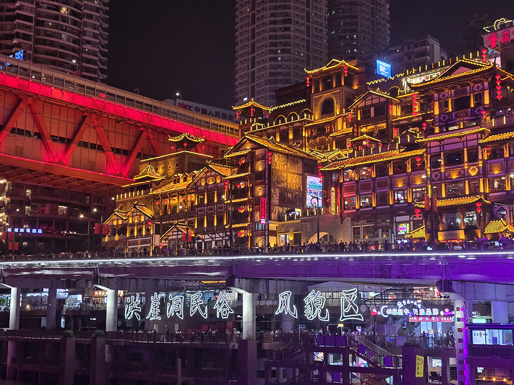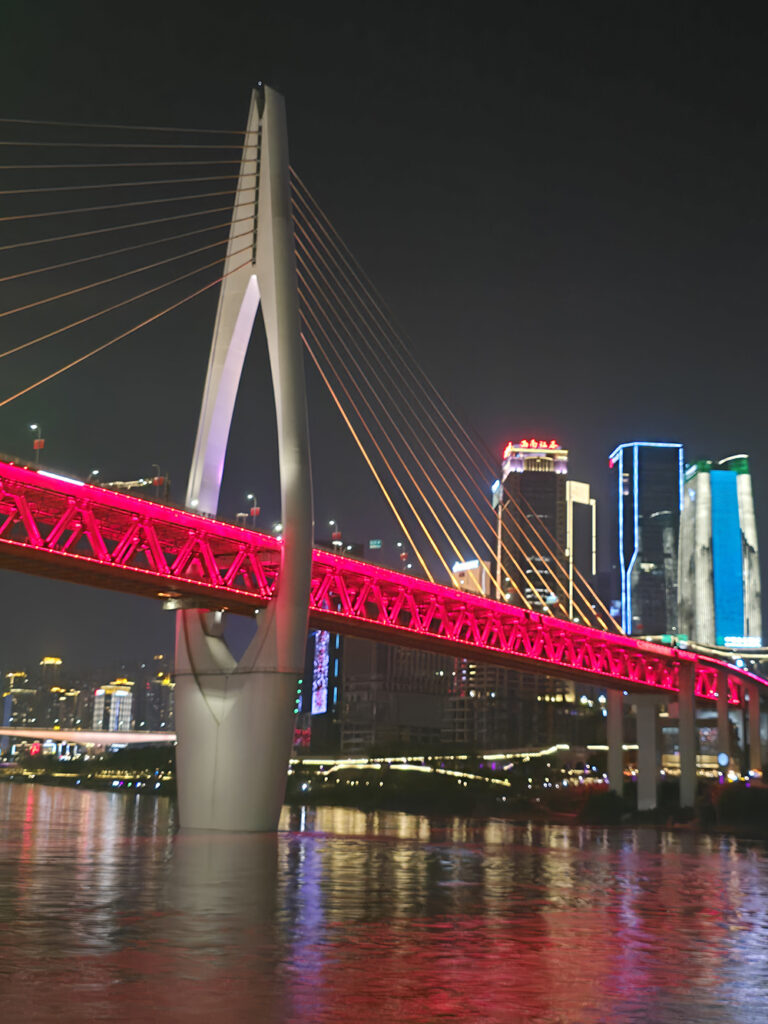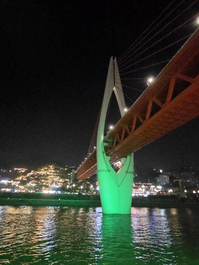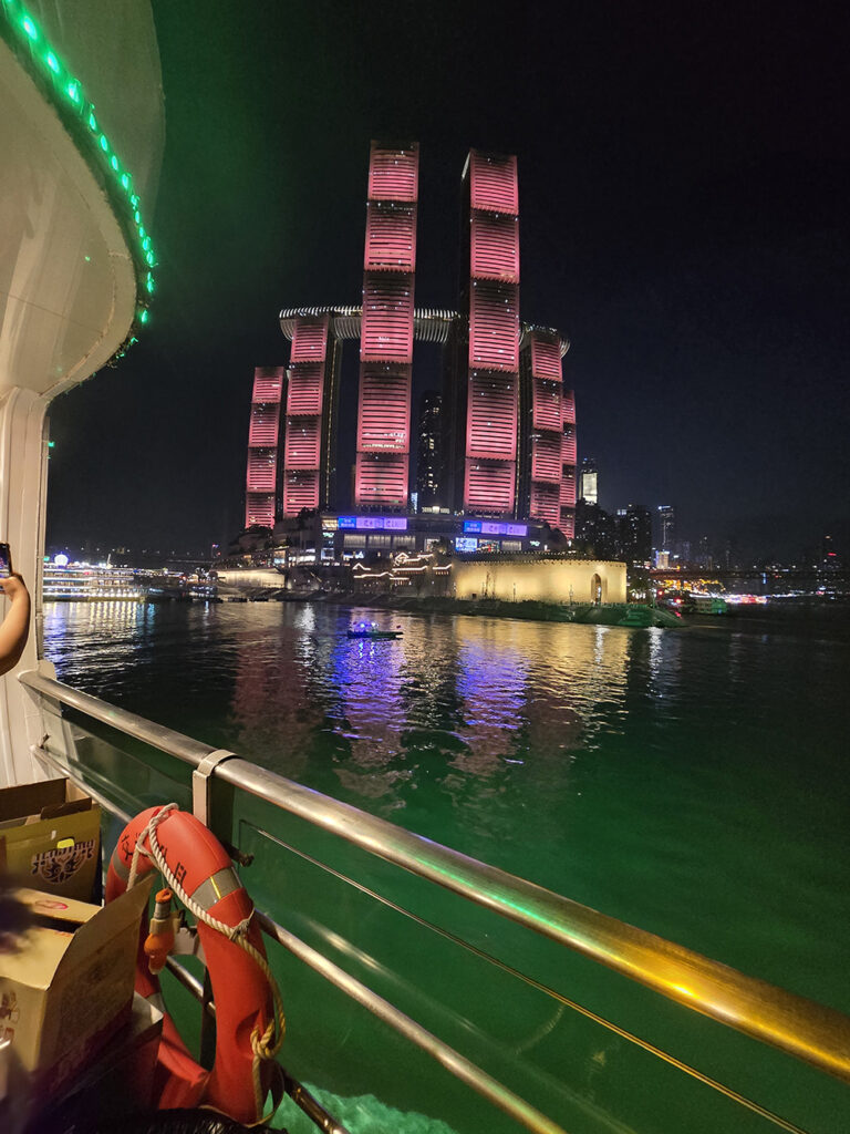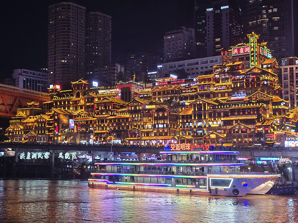 Nous sacrifions volontiers à « l’incontournable » balade en bateau, de nuit, à la confluence du Yangtsé (Chang Jiang) et de la Jialing (Jialing Jiang). Depuis les flots, la débauche de lumières illuminant la ville et ses monuments est assez magique.