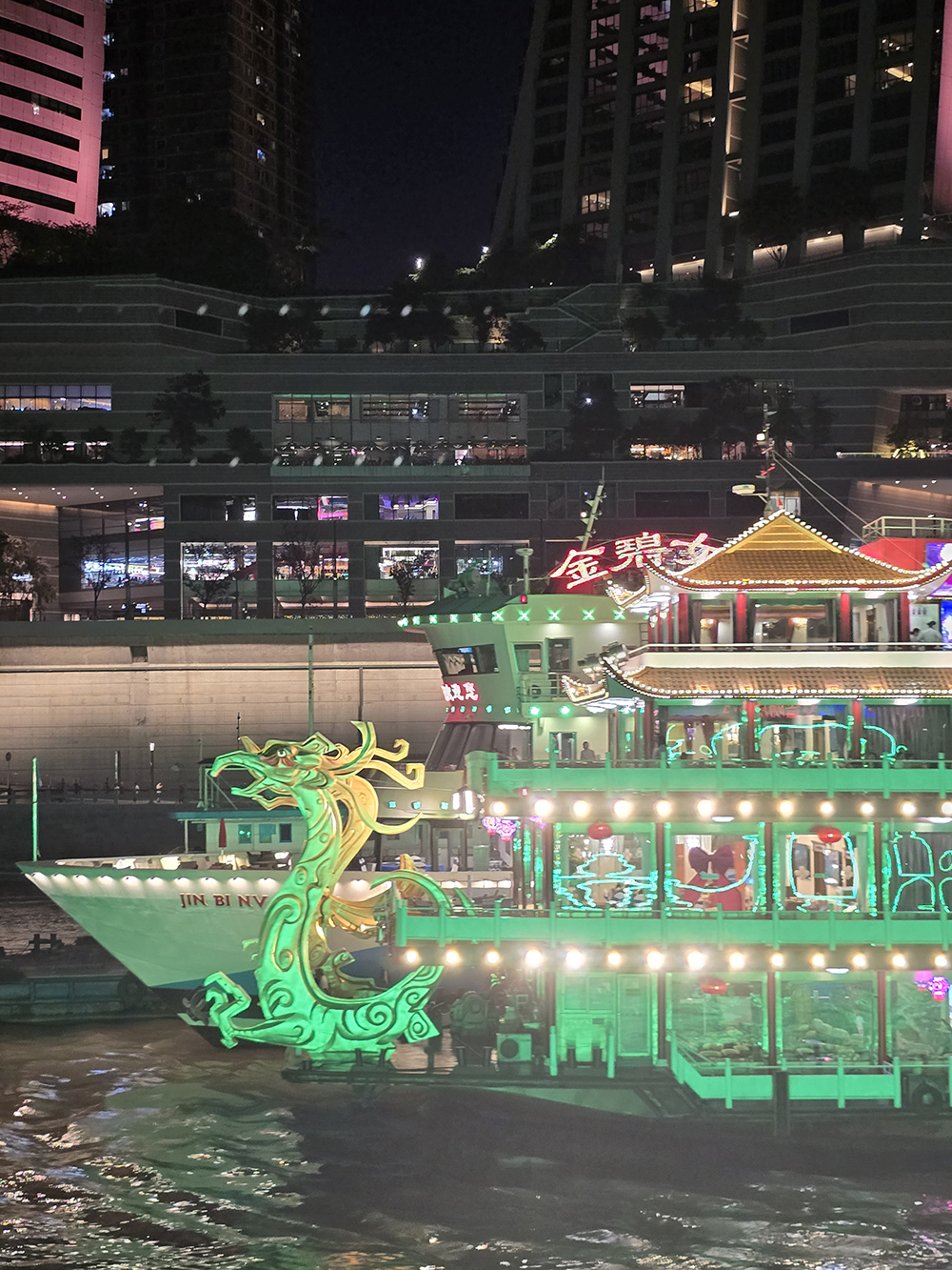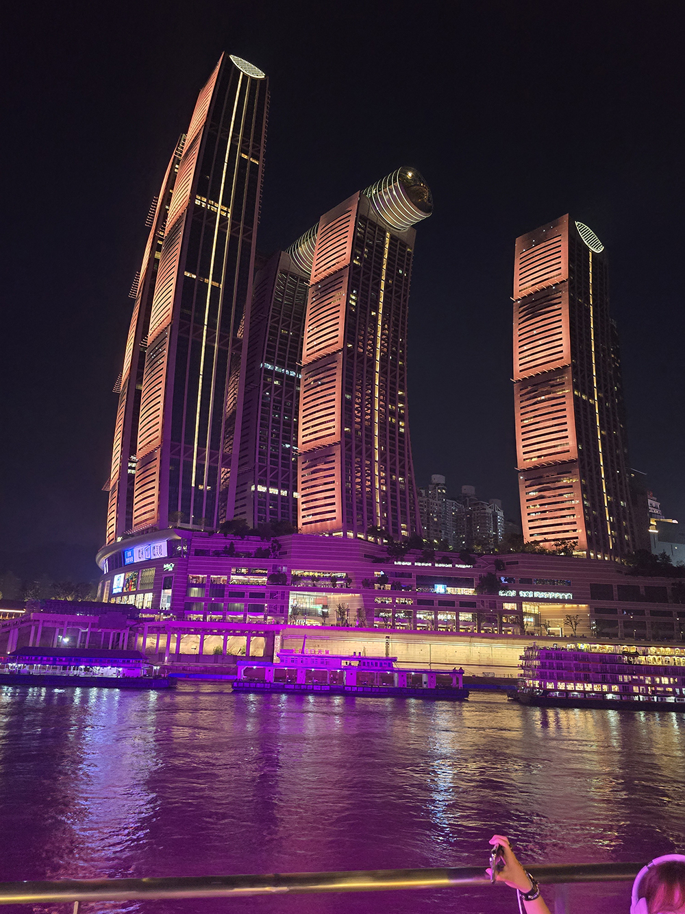 Nous sacrifions volontiers à « l’incontournable » balade en bateau, de nuit, à la confluence du Yangtsé (Chang Jiang) et de la Jialing (Jialing Jiang). Depuis les flots, la débauche de lumières illuminant la ville et ses monuments est assez magique.