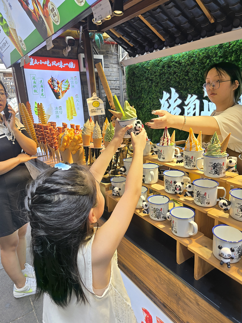 La Chine s’ouvrant au tourisme de masse (essentiellement chinois !), les produits « dérivés » sont produits en masse également. Pour séduire le chaland, les glaces sont déclinées à l’image du monument qu’on visite ou du fétiche national, le panda ! Une sorte de lèche-vitrine ?