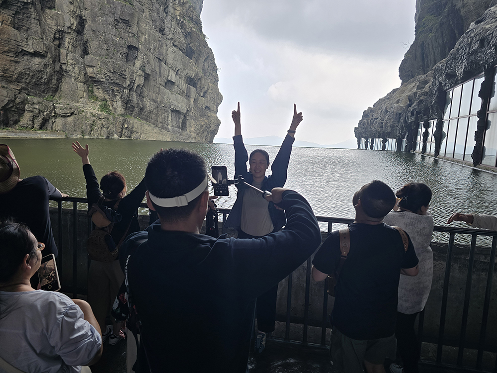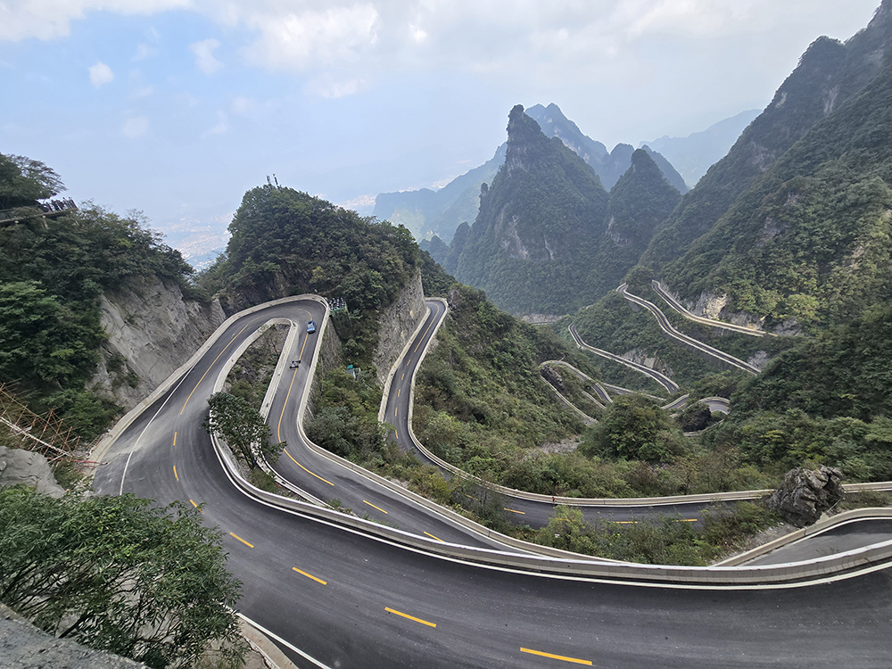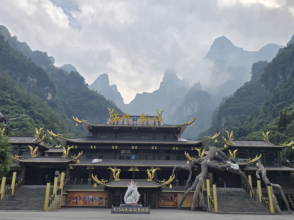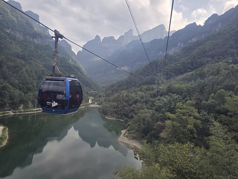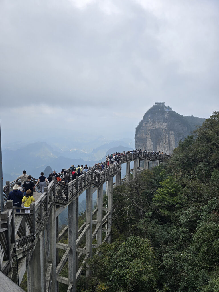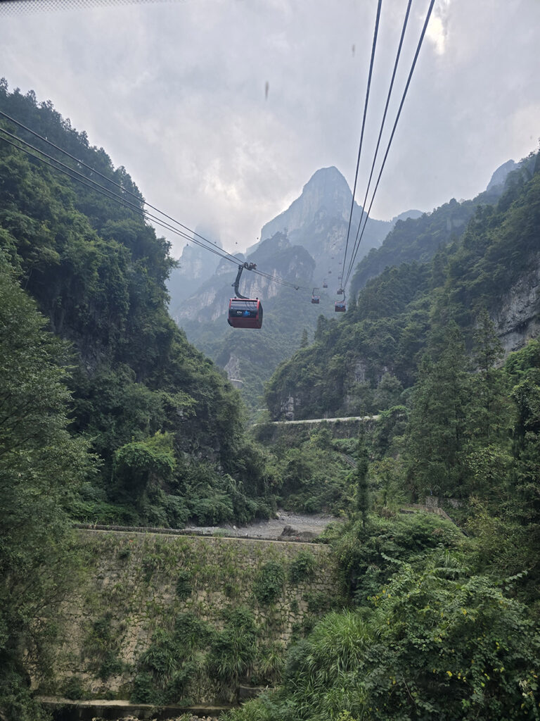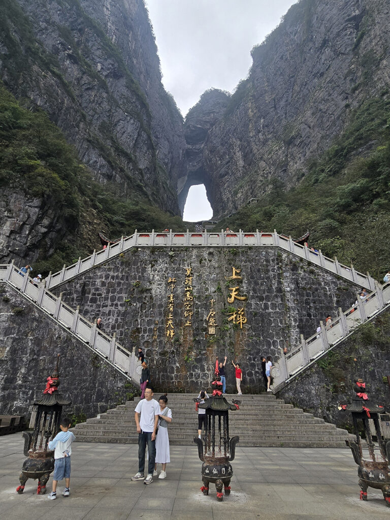 Depuis le centre-ville de Zhiangjiajie, on aperçoit le sommet du pic karstique de Tianmen (« porte du ciel ») et son énorme arche naturelle. On monte à proximité en télécabine mais une fois sur place, 999 marches restent à parcourir jusqu’au « trou ». Heureusement, des escalators creusés dans la roche peuvent suppléer les paresseux que nous sommes. En haut il est de bon ton de se livrer à une séance photos… On peut redescendre au centre-ville par le plus long télécabine du monde : 7,750 km !