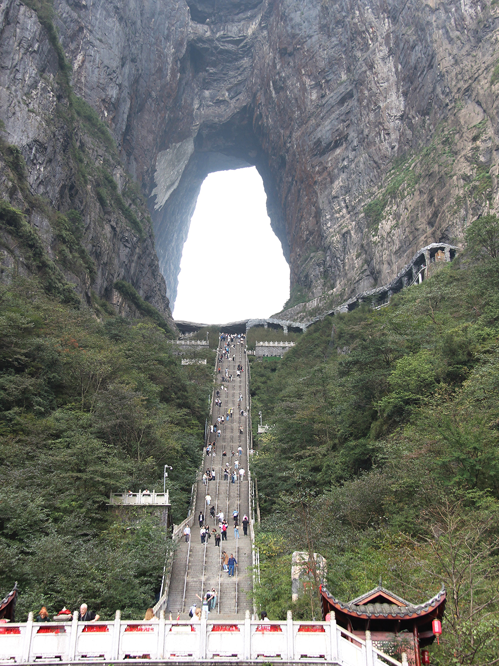 Depuis le centre-ville de Zhiangjiajie, on aperçoit le sommet du pic karstique de Tianmen (« porte du ciel ») et son énorme arche naturelle. On monte à proximité en télécabine mais une fois sur place, 999 marches restent à parcourir jusqu’au « trou ». Heureusement, des escalators creusés dans la roche peuvent suppléer les paresseux que nous sommes. En haut il est de bon ton de se livrer à une séance photos… On peut redescendre au centre-ville par le plus long télécabine du monde : 7,750 km !