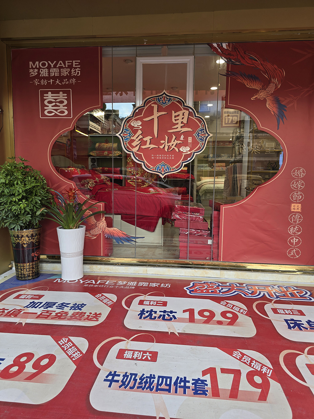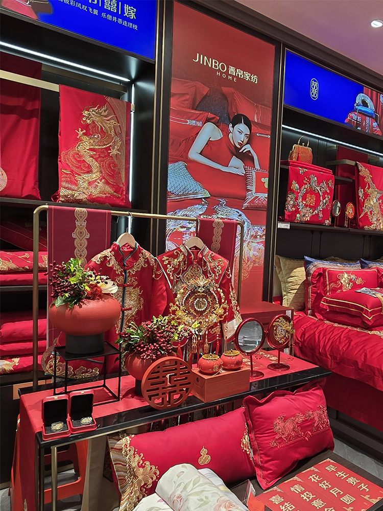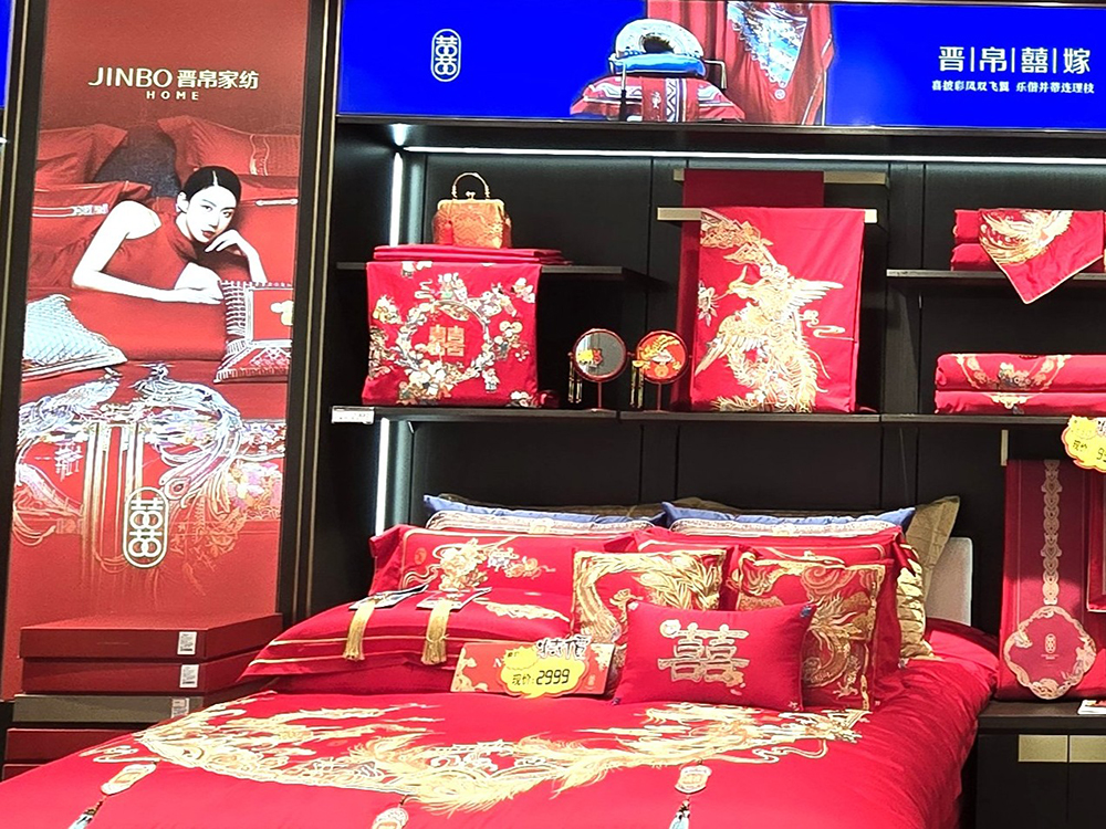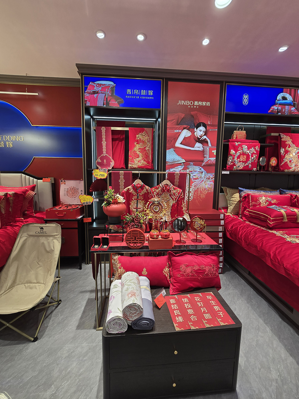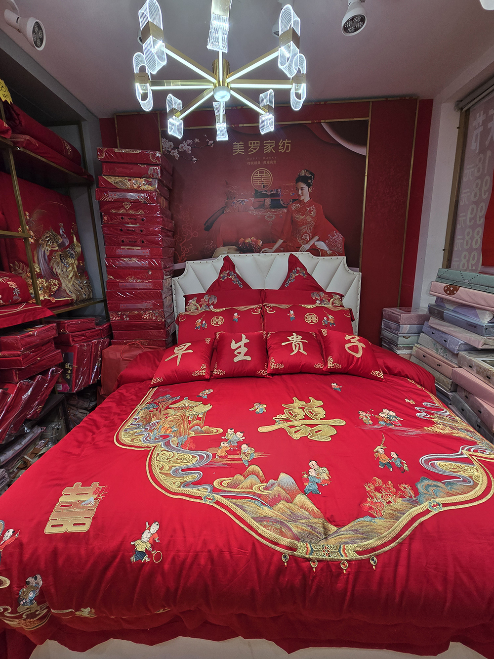 Dans le Guizhou, en cadeau de mariage, on offre une parure de lit. Rouge ! Couleur de la joie, de la bonne fortune, de la fécondité et… de la mariée ! C’est également la couleur qui éloigne les mauvais esprits. Le Dragon et le Phénix brodés sur cette literie symbolisent l’union du masculin et du féminin.