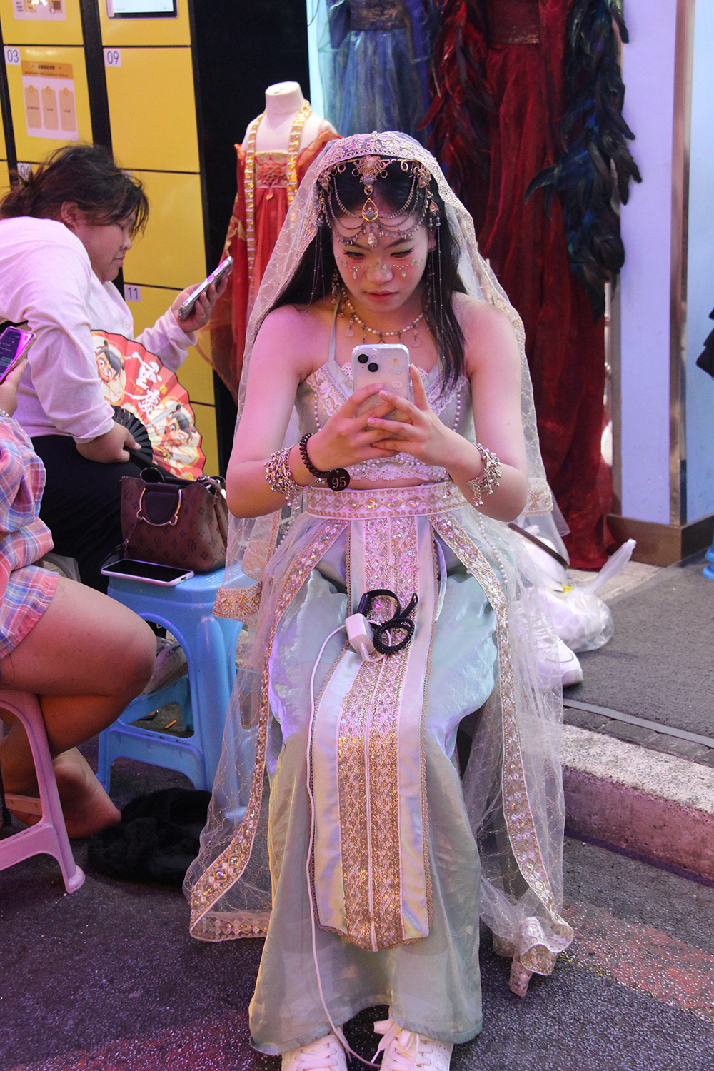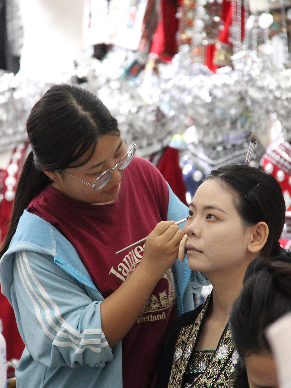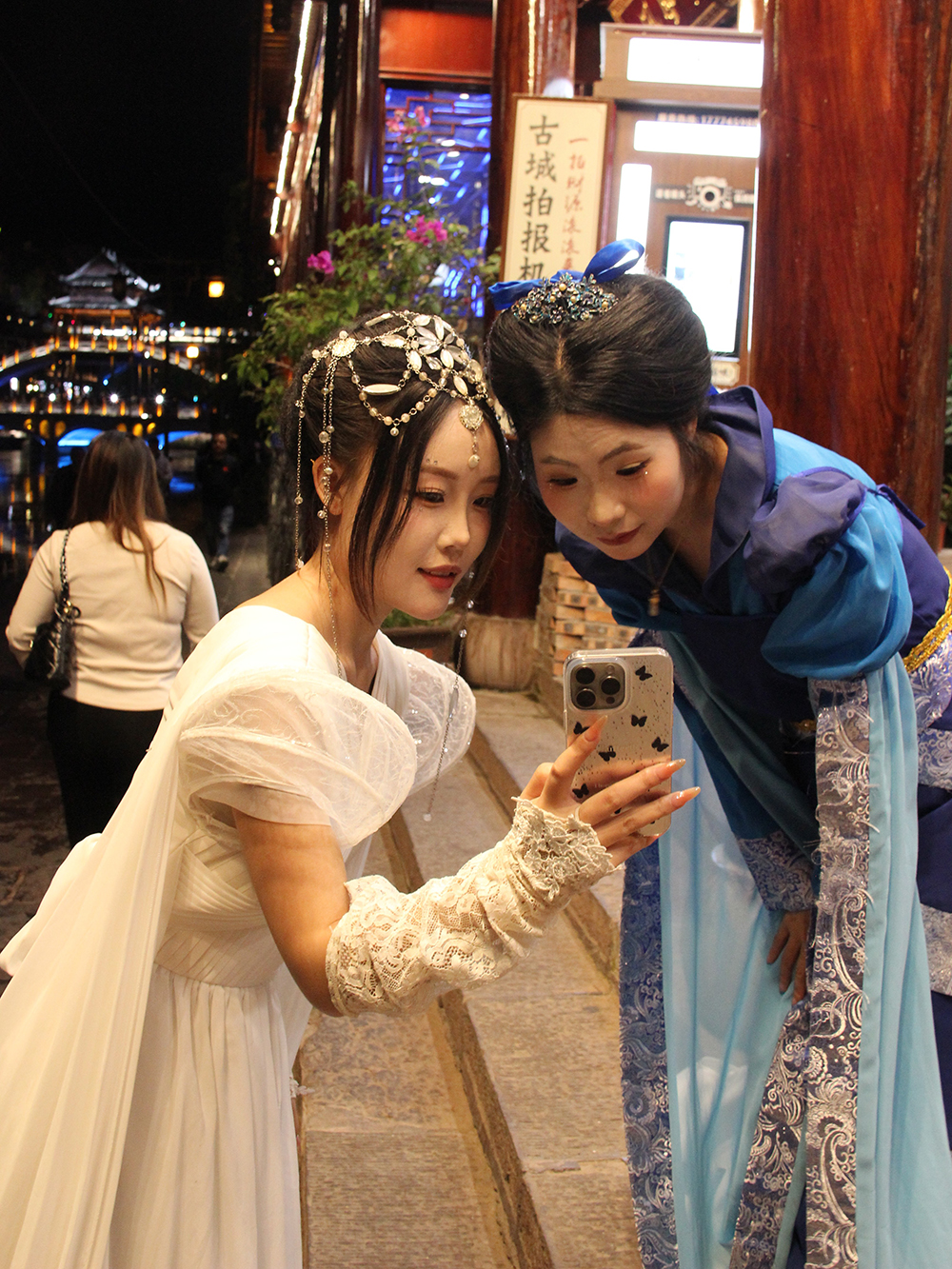 Le « grand jeu » (et le grand plaisir des Chinois) en vacances est de se travestir en costumes des minorités locales. Pour cette journée de location, tout commence par une longue séance de maquillage auprès d’une des très nombreuses boutiques dédiées, avant de déambuler jusqu’au soir, gravant l’événement dans les mémoires… des smartphones !