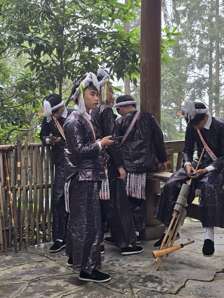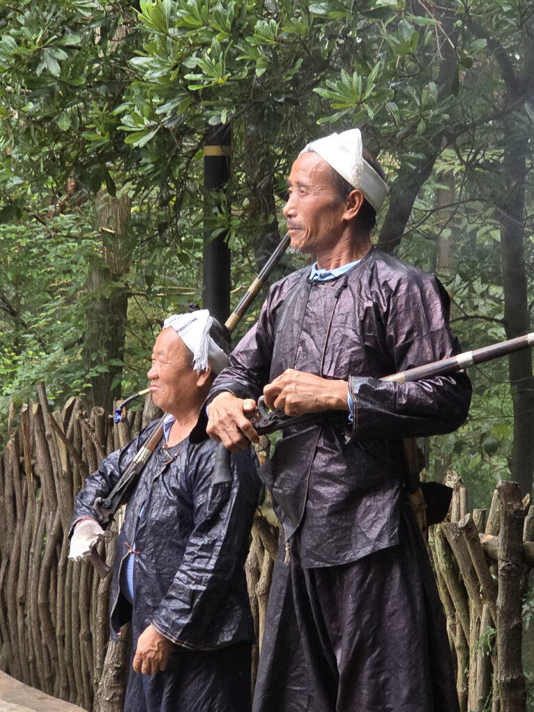 Tradition Miao, l’accueil des visiteurs se passe au son des chants des femmes accompagnées des « lushens », orgues à bouche. On tire aussi des salves des antiques fusils que les Miao sont très fiers d’être les seuls en Chine à avoir le droit de porter…