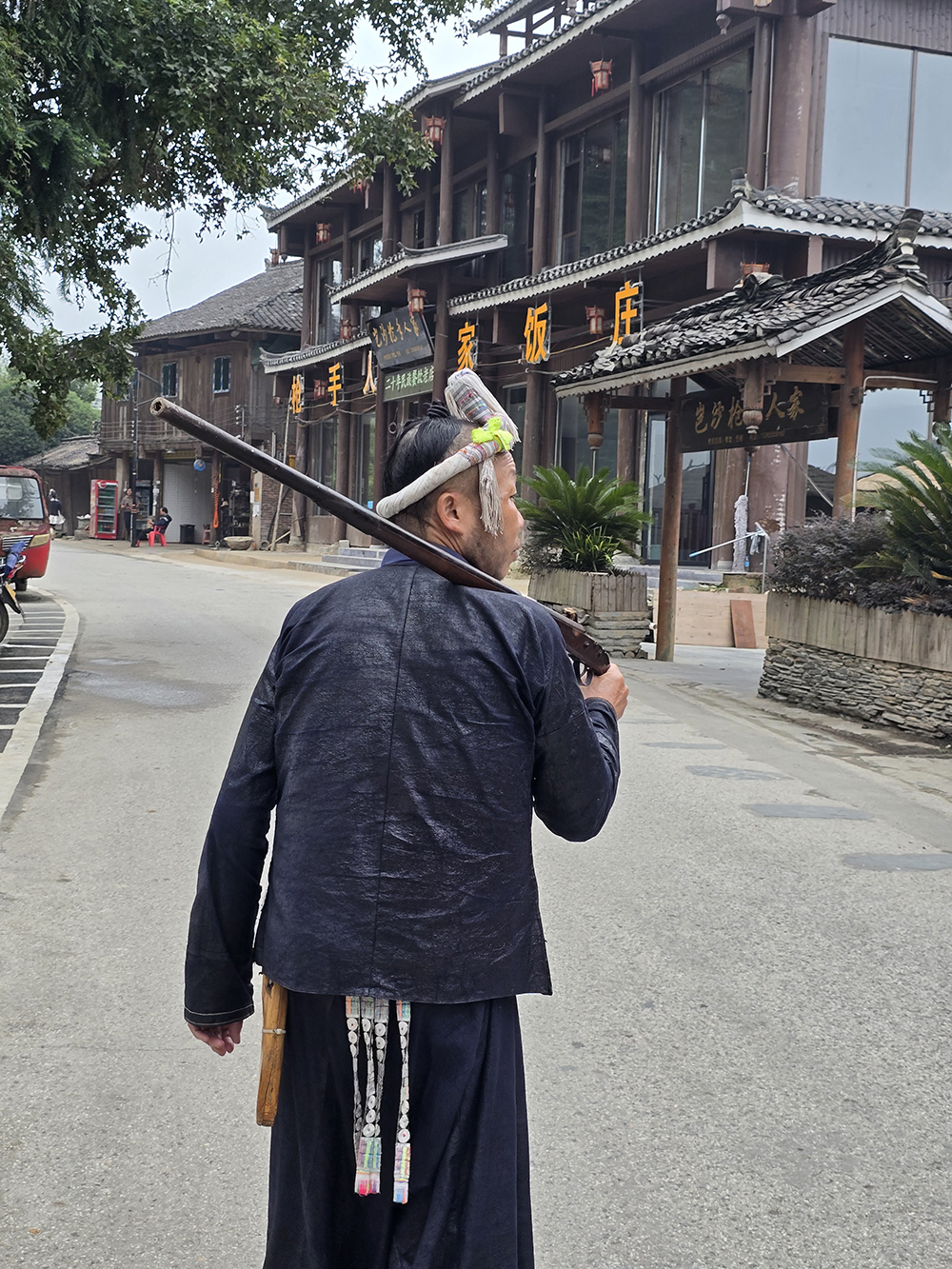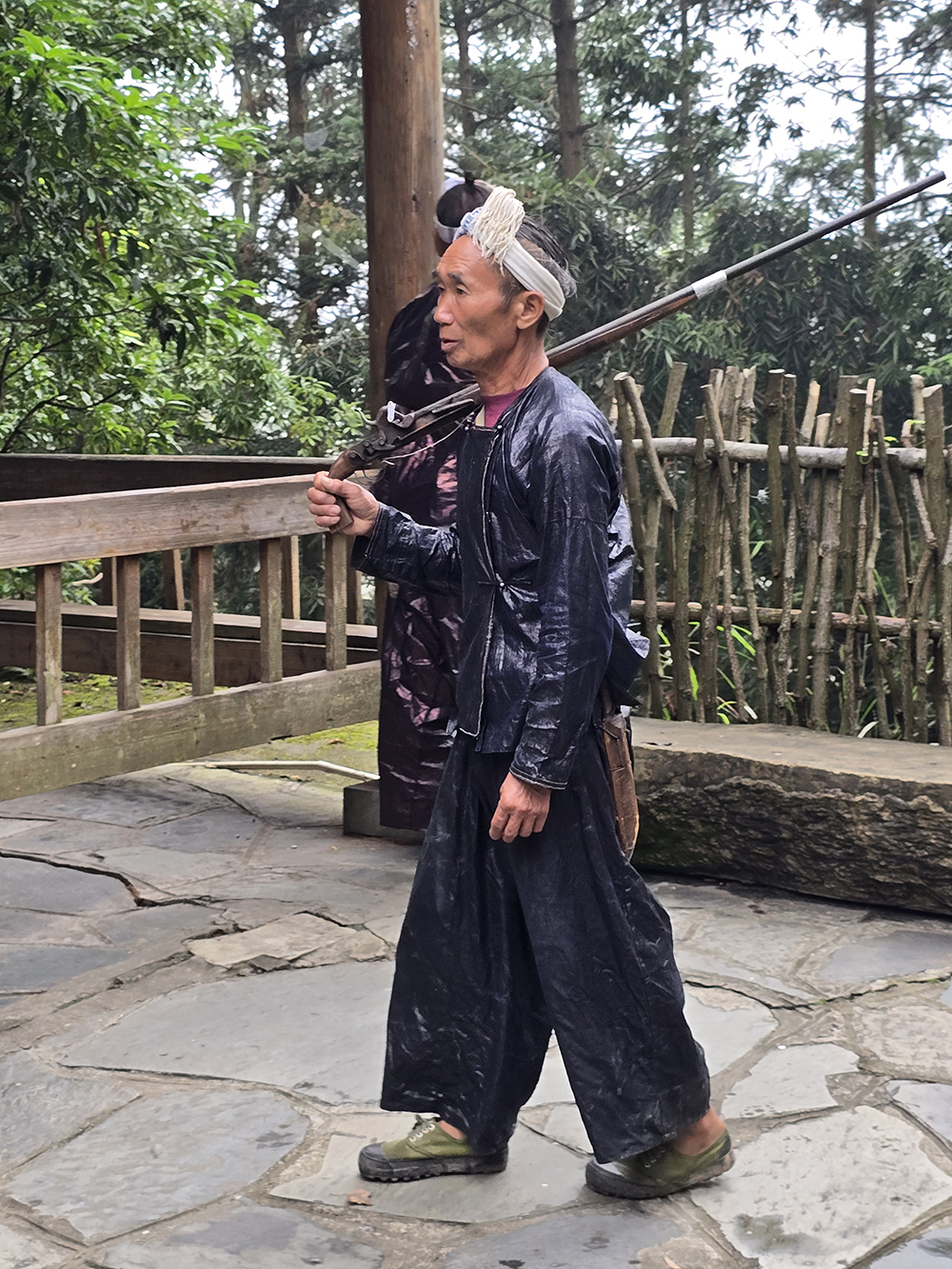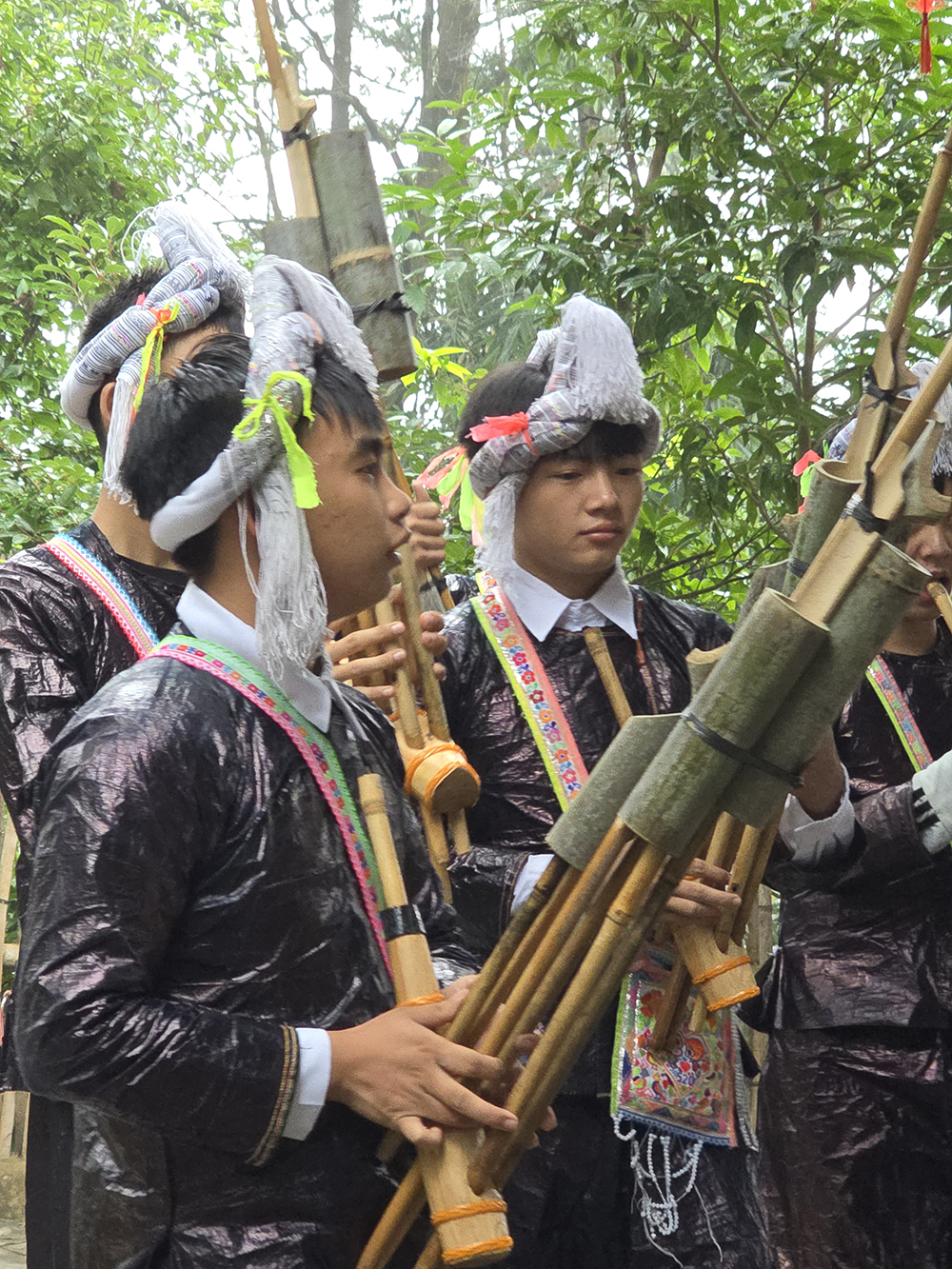 Tradition Miao, l’accueil des visiteurs se passe au son des chants des femmes accompagnées des « lushens », orgues à bouche. On tire aussi des salves des antiques fusils que les Miao sont très fiers d’être les seuls en Chine à avoir le droit de porter…