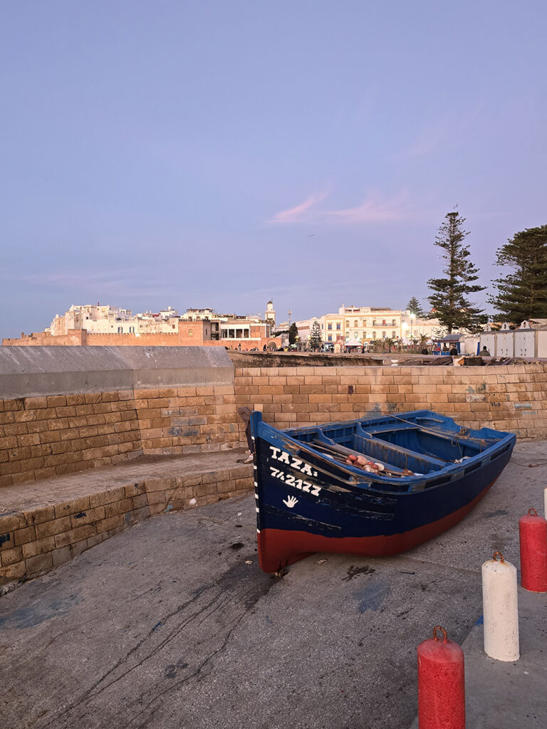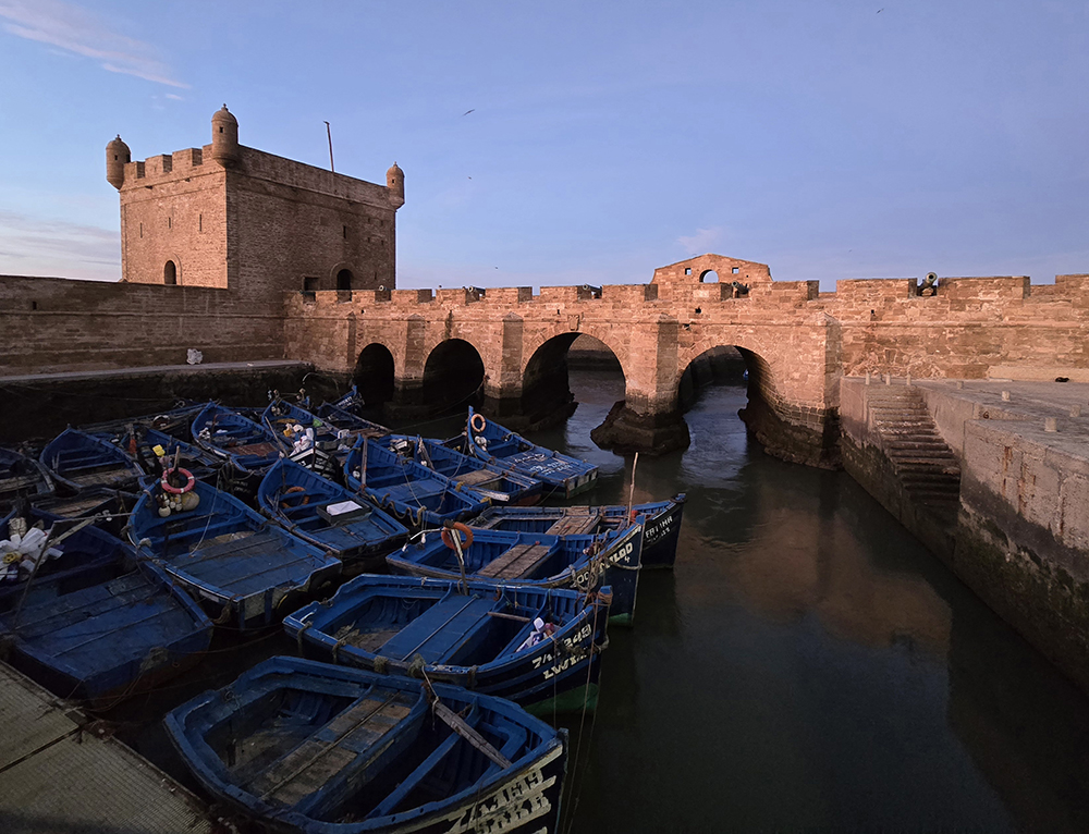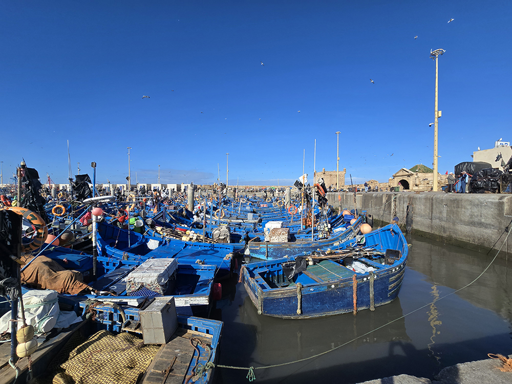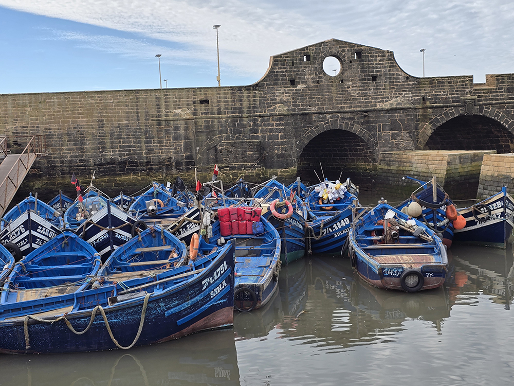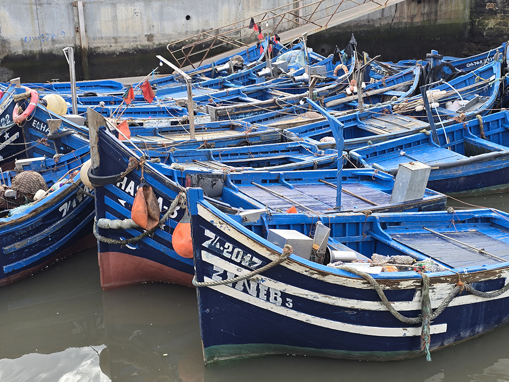 A Essaouira, la pêche est une activité traditionnelle depuis des siècles. Les célèbres barques bleues continuent d’être utilisées, entretenues et bien cachées des tempêtes dans l’enceinte du port fortifié.