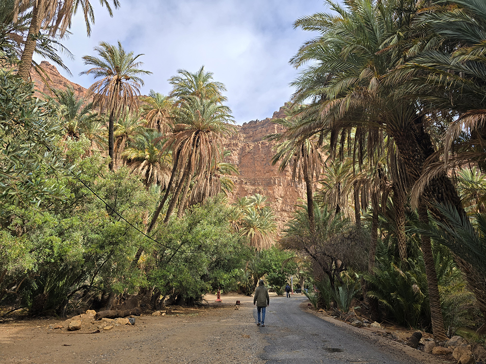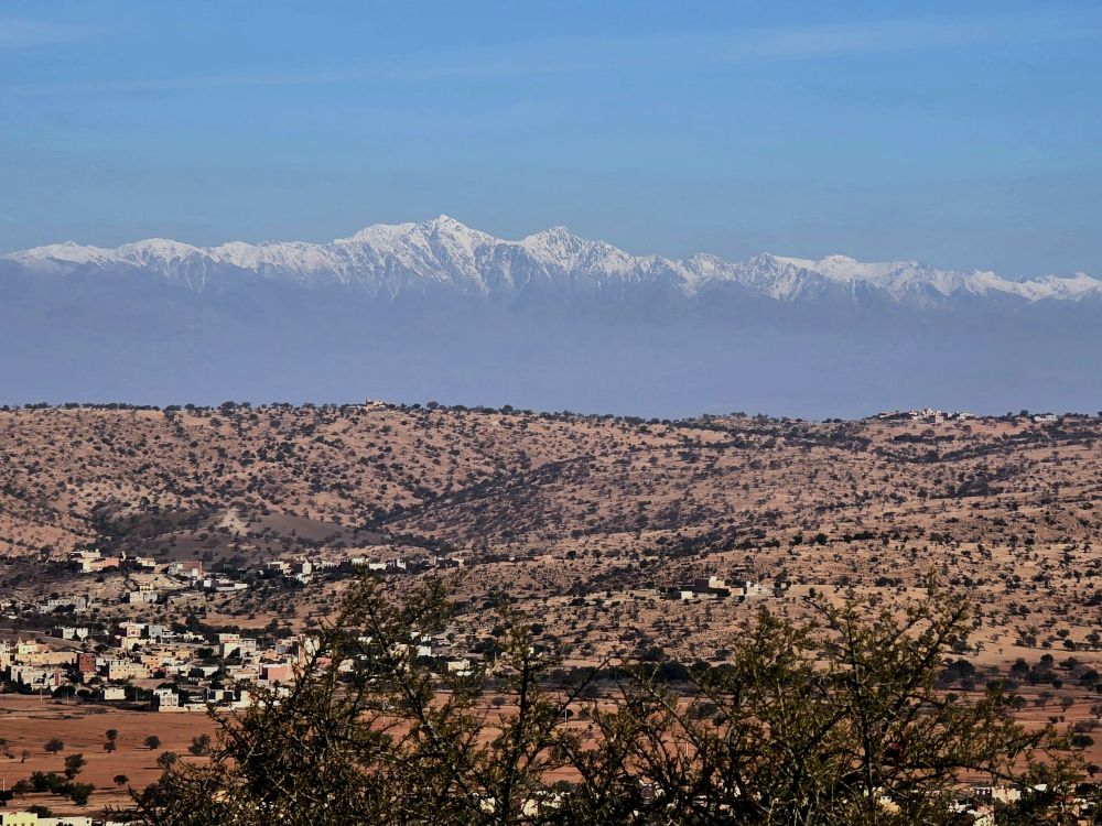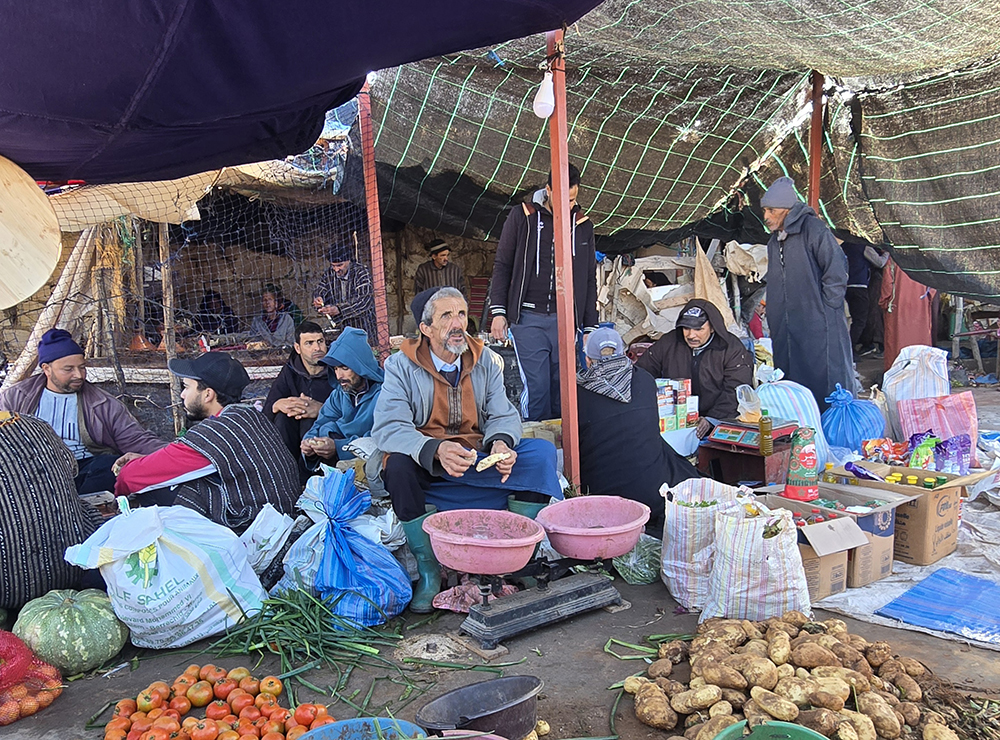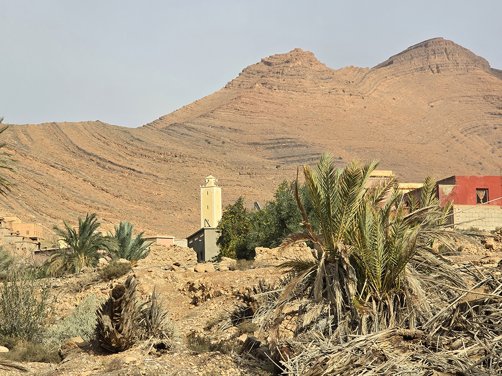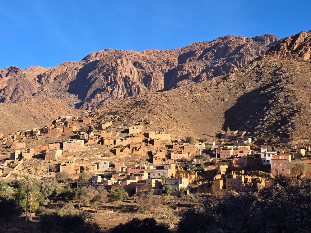 Lundi 15 décembre :  Après être passés dire au revoir à nos amis on attaque une superbe route de montagne dans l’Anti-Atlas pour monter à Tafraout (900m altitude). On se loge à l’hôtel « Les Amis » et on part se balader jusqu’au vieux village voisin où l’on visite une belle « maison traditionnelle berbère ». Ensuite on parcourt le souk des fabricants de babouches. Dîner au restaurant « la Kasbah » qui propose une bonne cuisine.