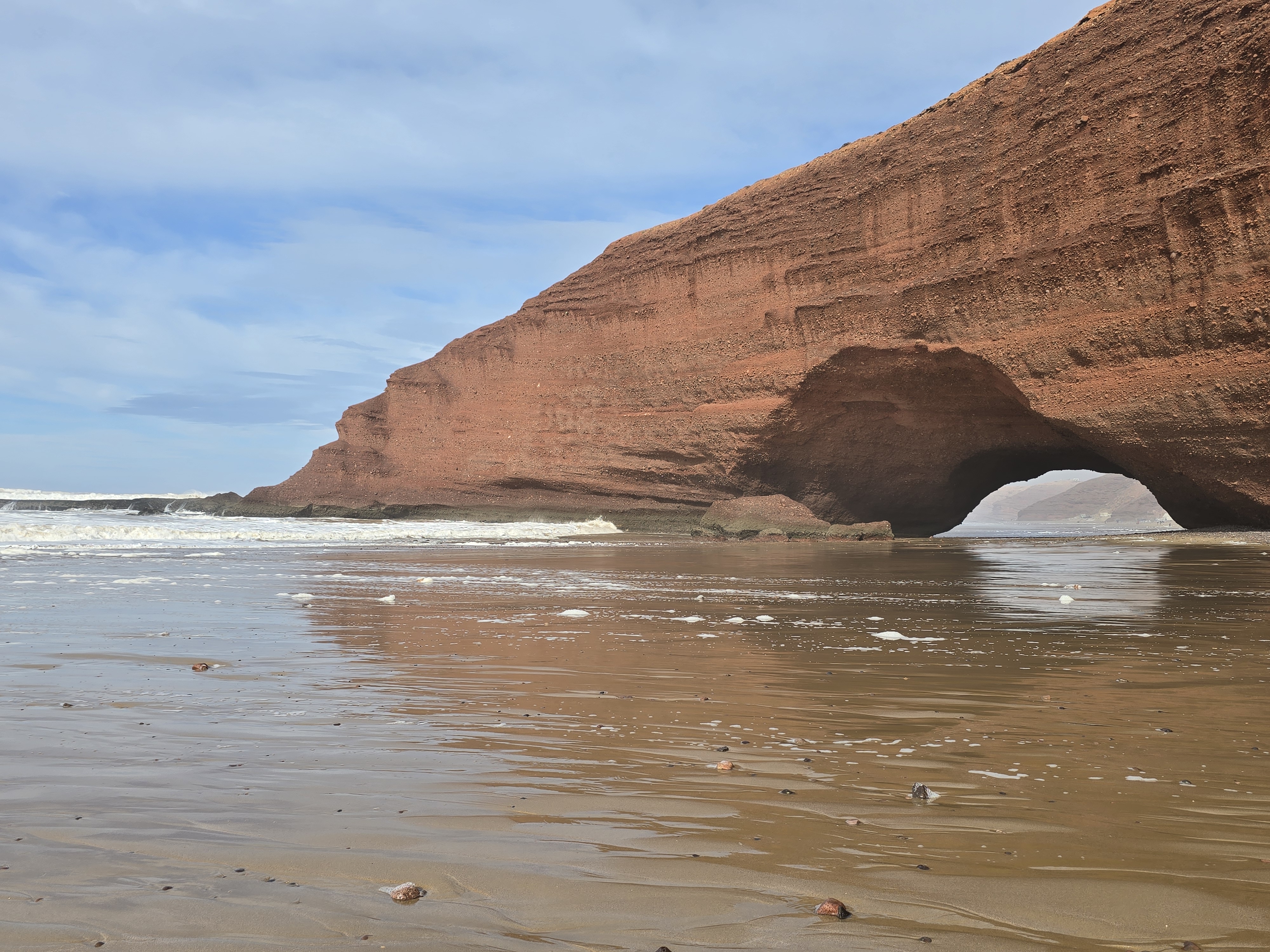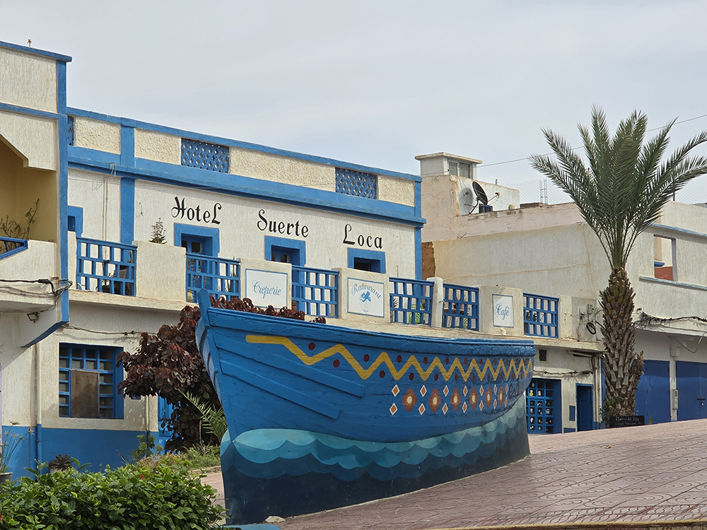 Samedi 13 décembre : Il a plu toute la nuit! On part pour Guelmin pour voir le marché aux dromadaires. On est déroutés à cause de l’oued qui a débordé! Le Souk du samedi est bien animé mais décevant pour les dromadaires! On continue notre route vers la côte. Sidi-Ifni est un joli village bleu et blanc aux airs de Grèce, on s’y arrête pour visiter et reprenons notre route pour voir la fameuse arche naturelle dans la falaise sur la belle plage de Legzira. Nous passons la soirée à Mirleft, une petite escale sympathique.