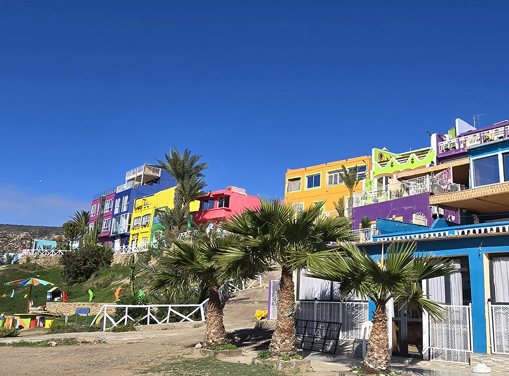 Dimanche 21 décembre : Retour sur Agadir pour rendre la voiture de location le soir. On commence par aller voir à Had Dra un très grand souk au Nord d’Essaouira. Sur la route d’Agadir à la plage d’Aghroud on visite un village de surfeurs tout en couleurs. On passe la soirée dans une guesthouse tout près de l’aéroport.