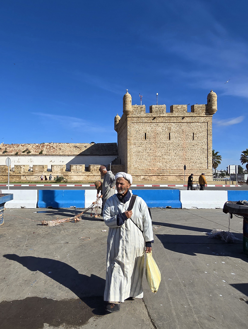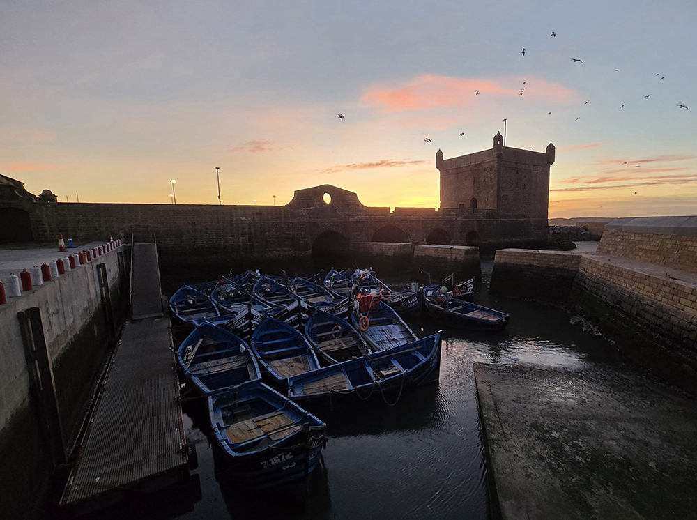 Jeudi 18 décembre : Nous quittons Tafraout pour aller à Essaouira. En route nous nous arrêtons à la Kasbah de Tizorgan, très photogénique. En route on aperçoit le Haut Atlas enneigé. Nous arrivons à Essaouira à temps pour découvrir la médina et voir le coucher de soleil sur les bateaux .
