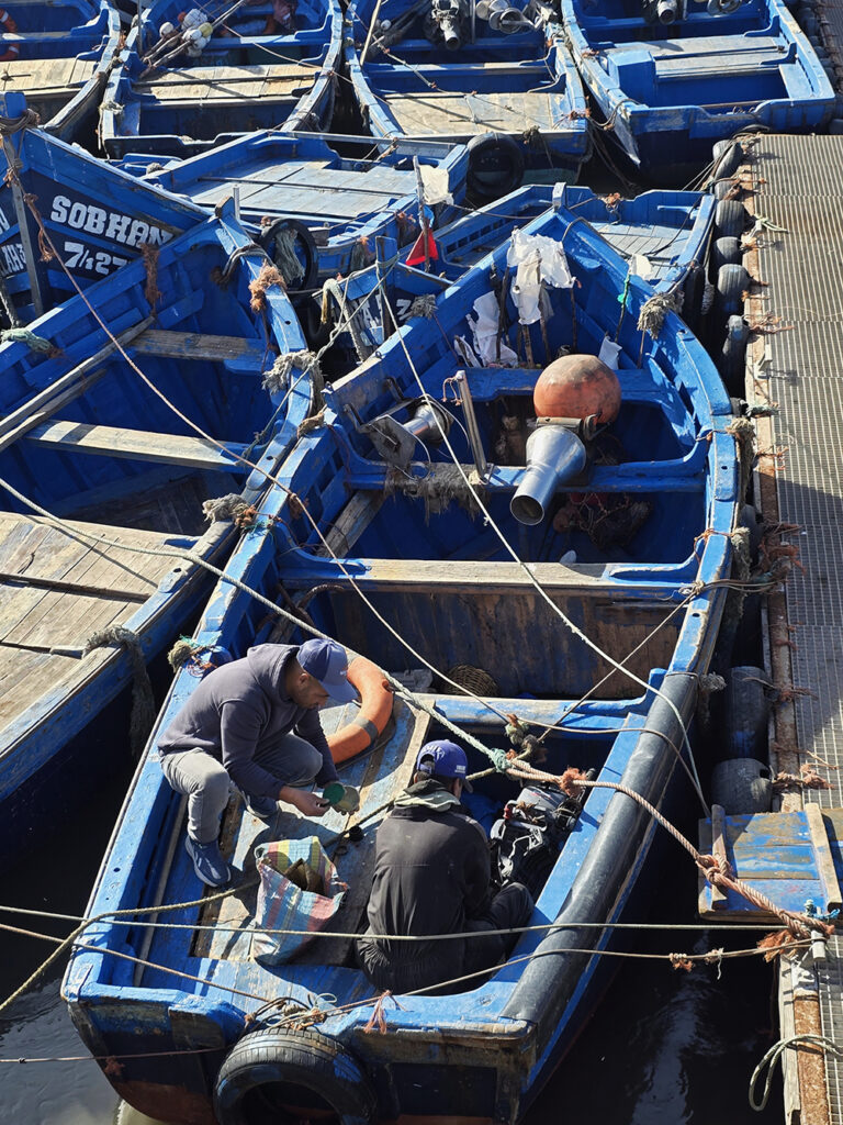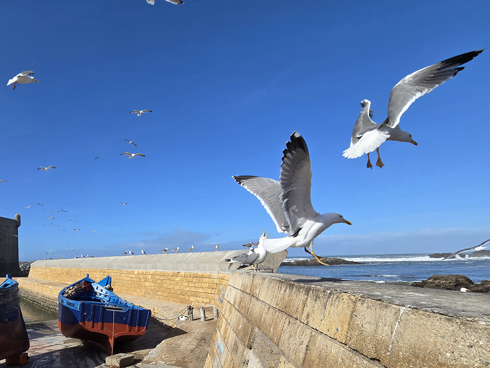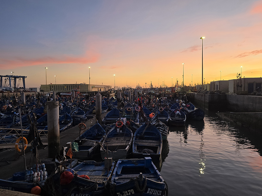 Vendredi 19 décembre : Nous allons voir le port de pêche et faire un tour dans la médina. Cette ville est très sympathique malgré la foule de touristes marocains et internationaux. On s’éloigne un peu de cette foule pour découvrir des quartiers populaires avant d’aller boire un verre au soleil couchant sur la grande plage.