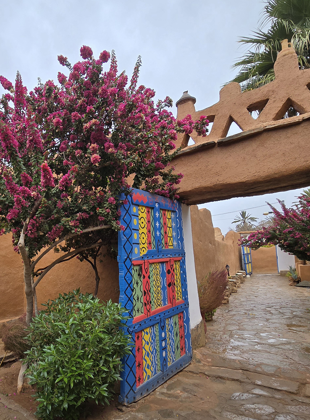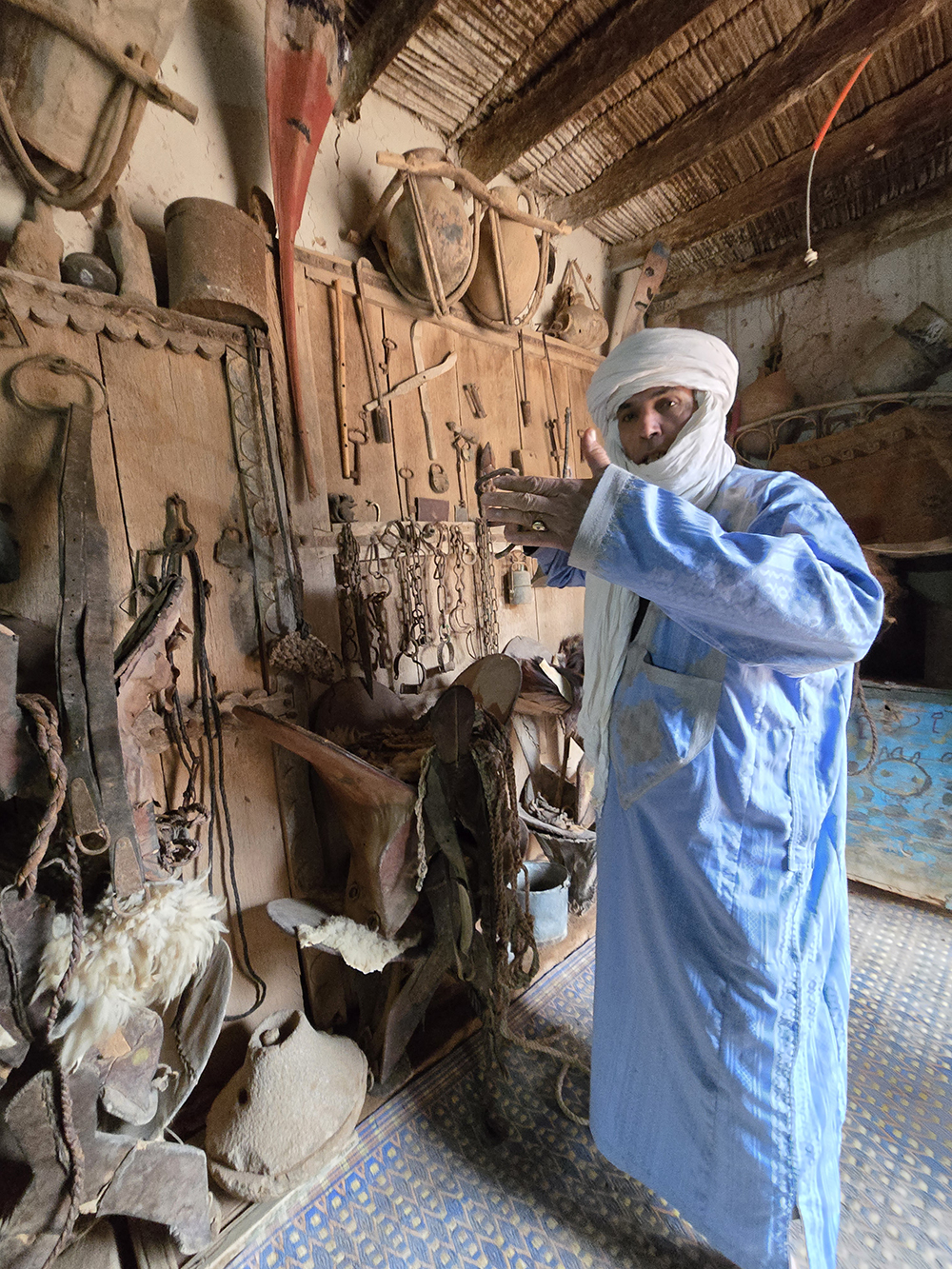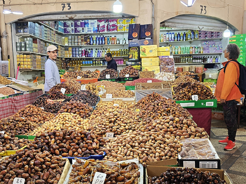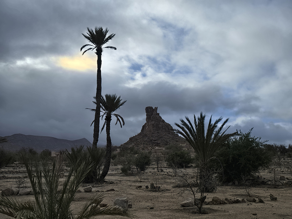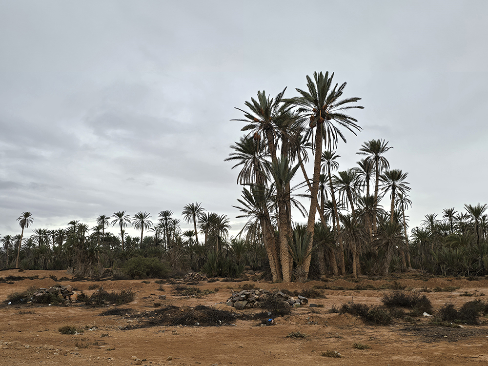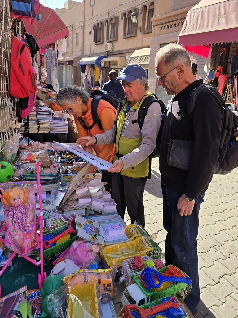 Vendredi 12 décembre : Il bruine, on part pour l’oasis de Tighmert. On s’arrête à Regada pour parcourir le souk qui nous semble bien animé. On arrive à l’oasis sous la pluie : la première depuis des années! On se fait guider pour aller visiter la « Kasbah-musée » de Tighmert. Soirée chez nos hôtes de la « Maison nomade ».