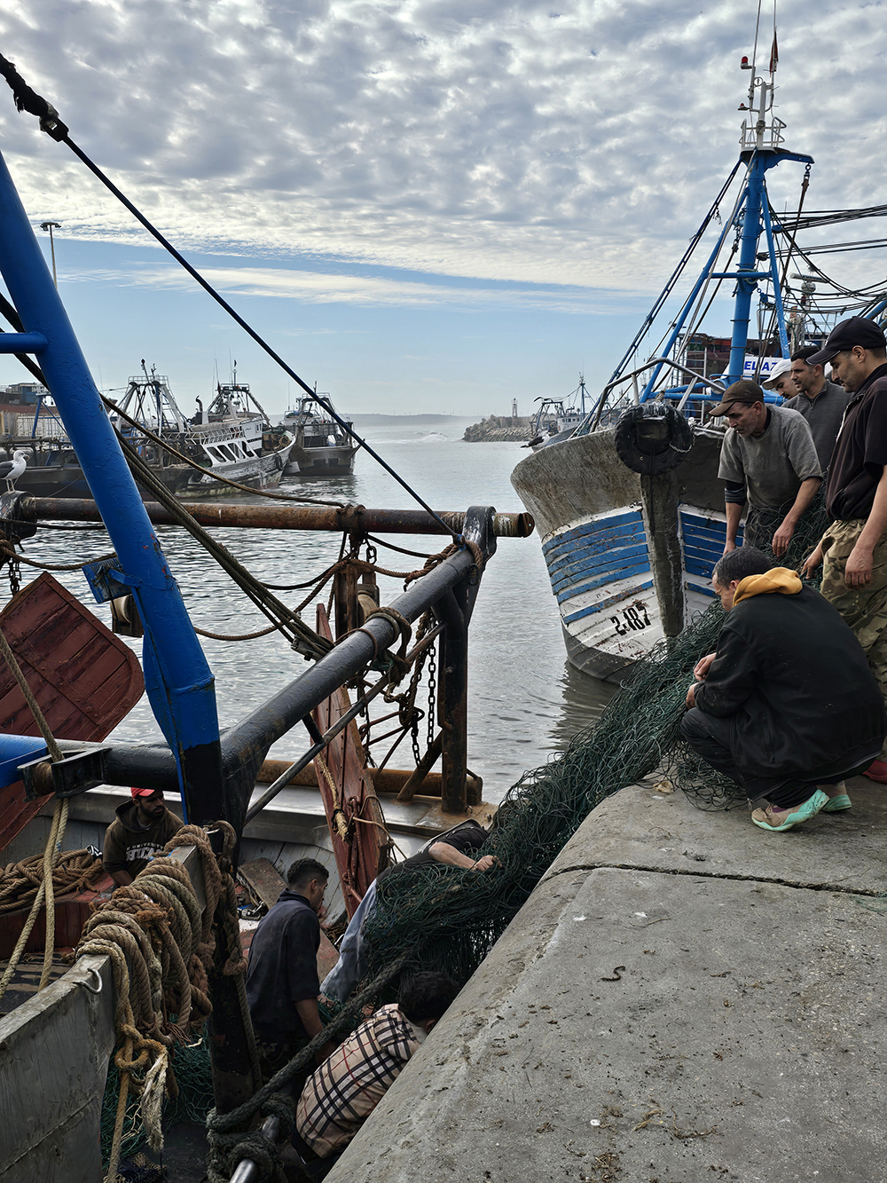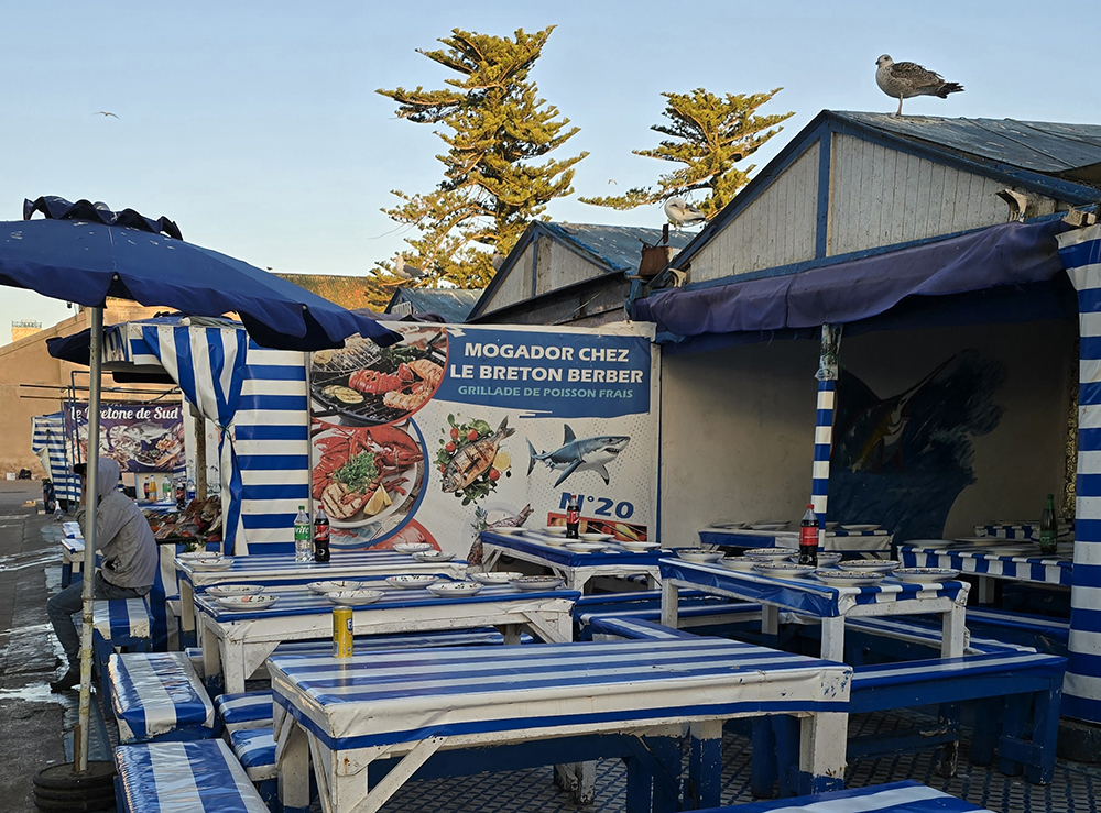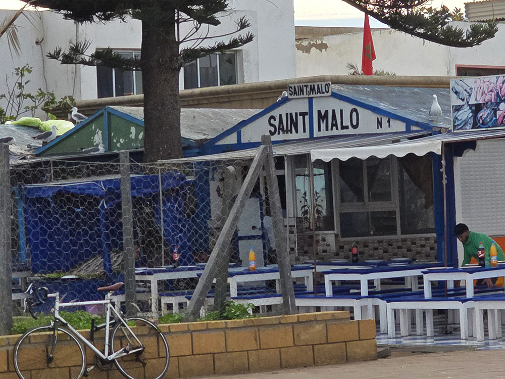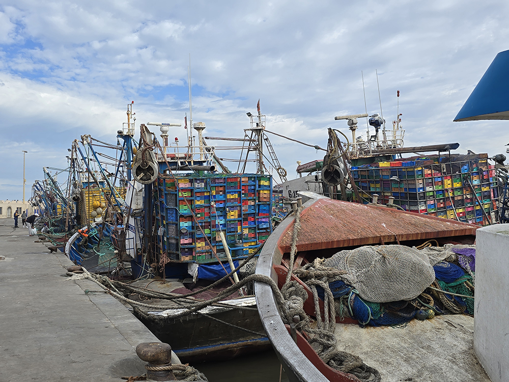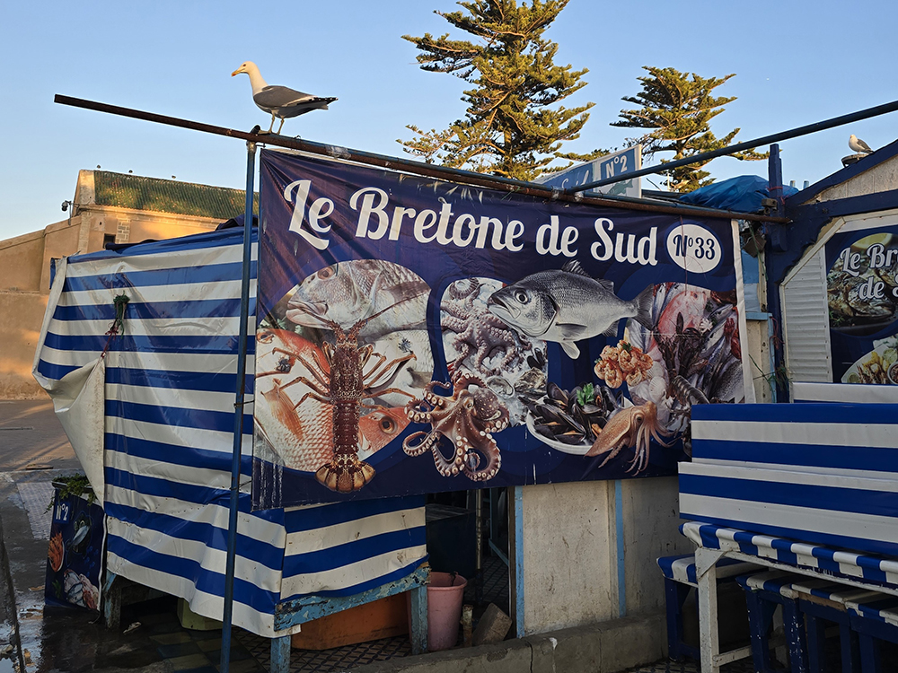 Hormis les centaines de grosses barques bleues, Essaouira possède une grande flotte de gros chalutiers, c’est un énorme port. On y trouve curieusement des échoppes de poissons au noms évoquant la France « La Rochelle », et particulièrement la Bretagne : « Said le Breton », « Au St Malo », « La Bretone de Sud », « Mogador chez le Breton Berber »…