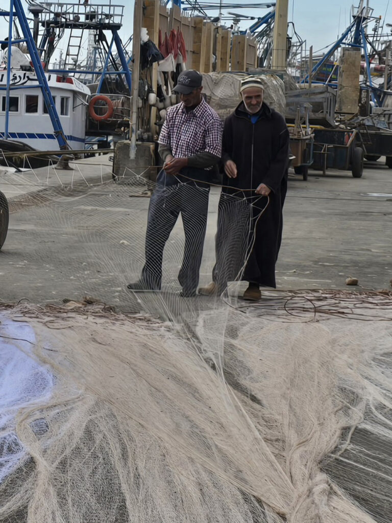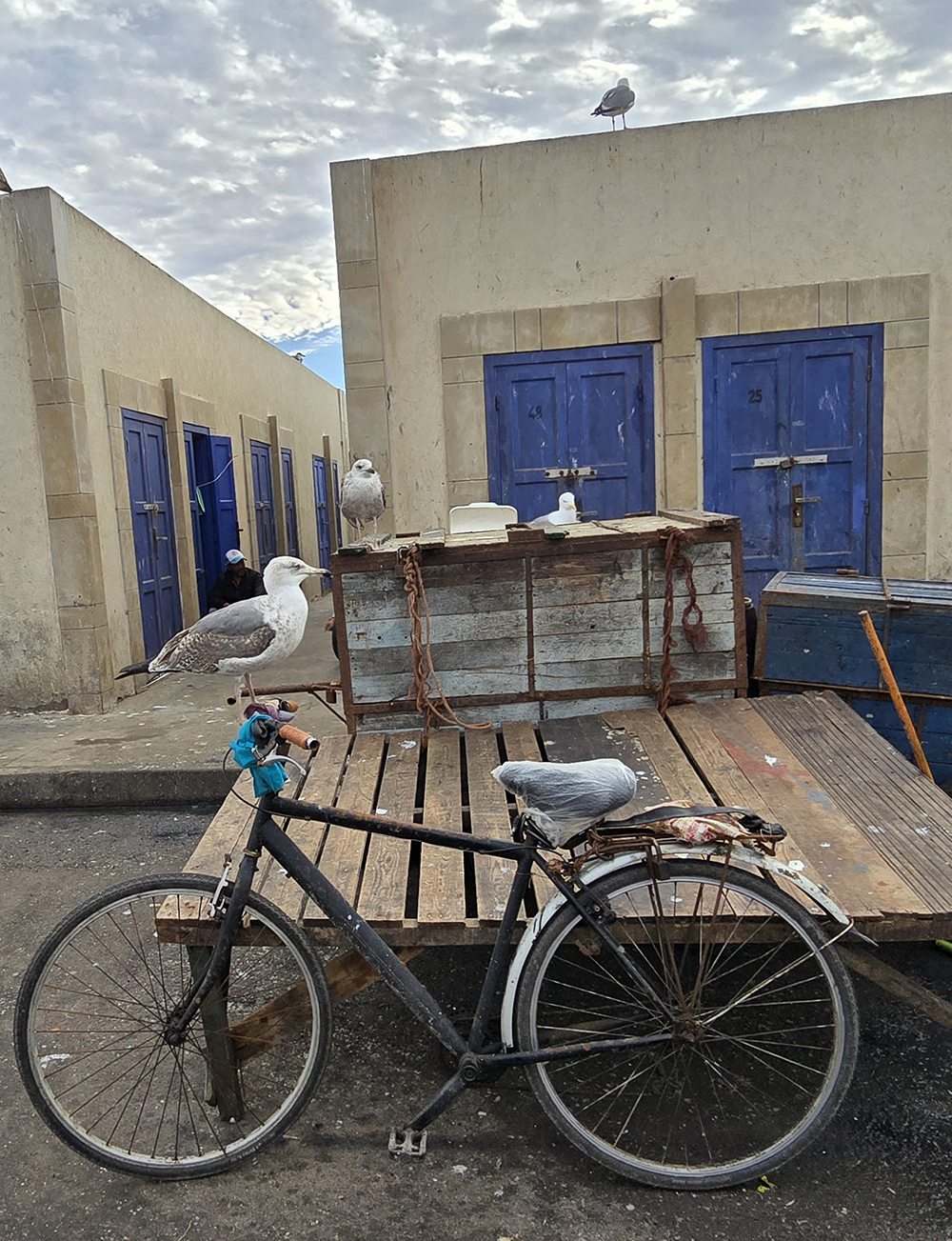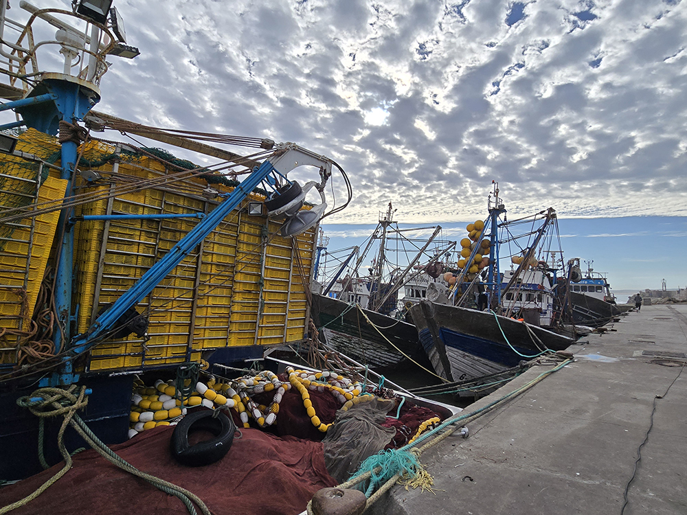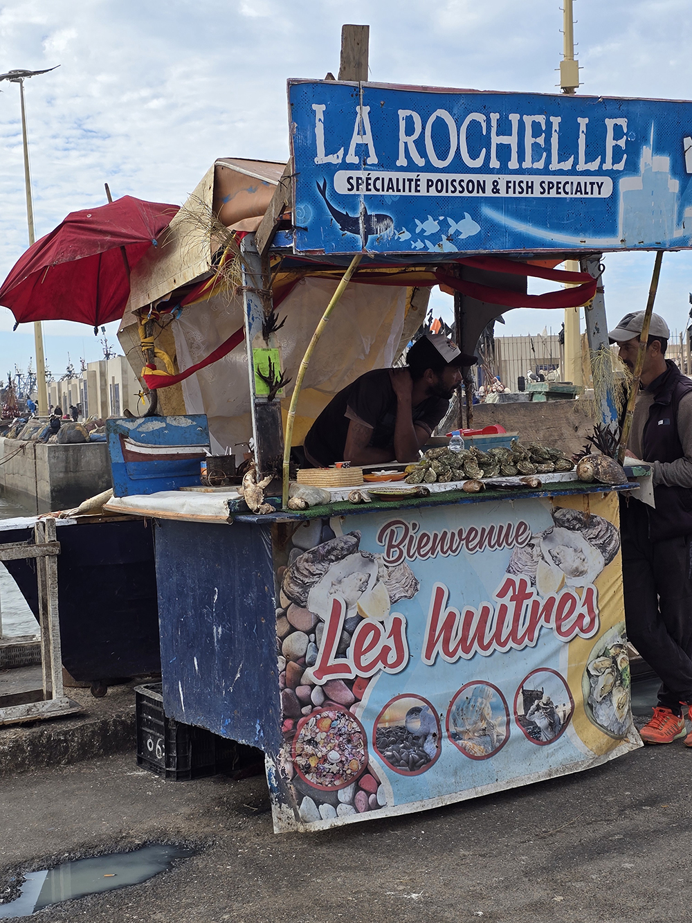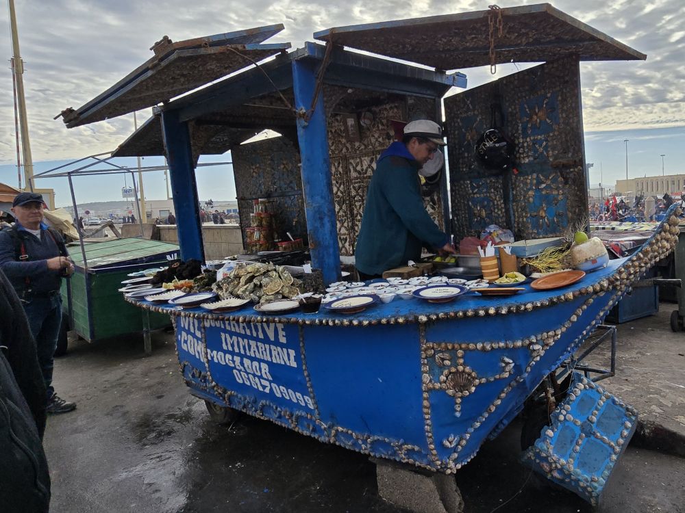 Hormis les centaines de grosses barques bleues, Essaouira possède une grande flotte de gros chalutiers, c’est un énorme port. On y trouve curieusement des échoppes de poissons au noms évoquant la France « La Rochelle », et particulièrement la Bretagne : « Said le Breton », « Au St Malo », « La Bretone de Sud », « Mogador chez le Breton Berber »…
