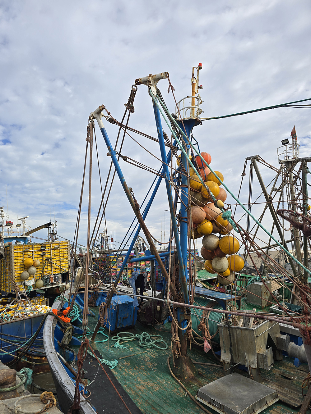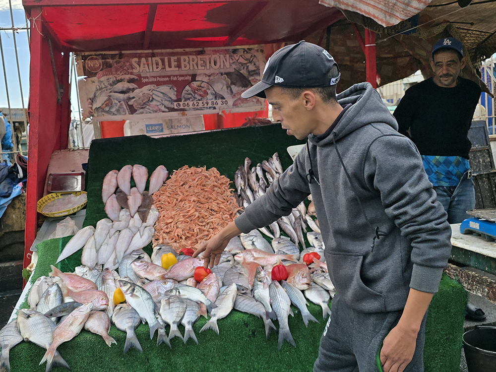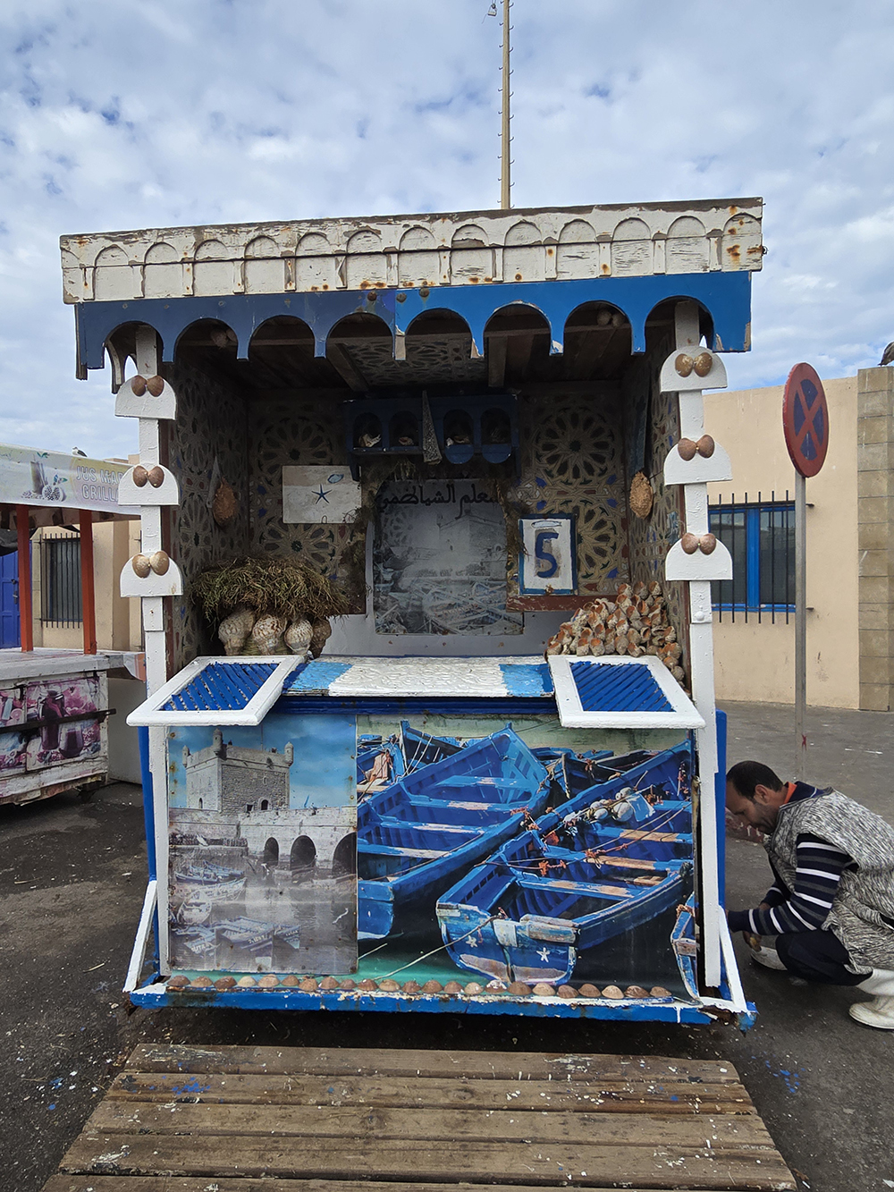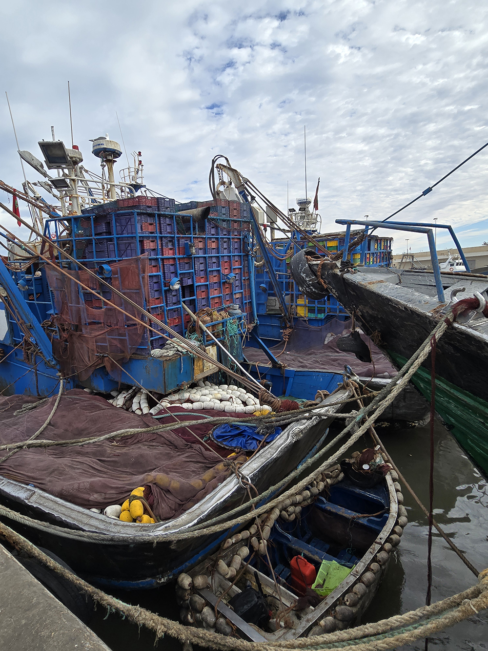 Hormis les centaines de grosses barques bleues, Essaouira possède une grande flotte de gros chalutiers, c’est un énorme port. On y trouve curieusement des échoppes de poissons au noms évoquant la France « La Rochelle », et particulièrement la Bretagne : « Said le Breton », « Au St Malo », « La Bretone de Sud », « Mogador chez le Breton Berber »…