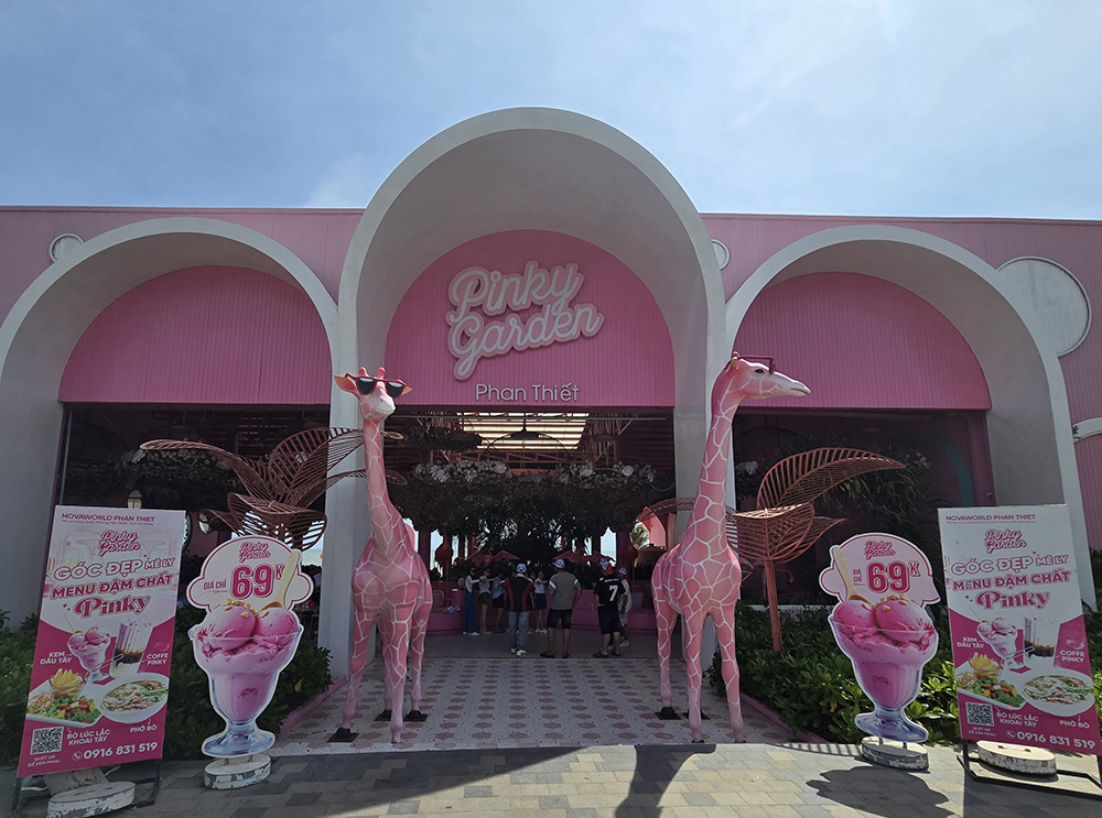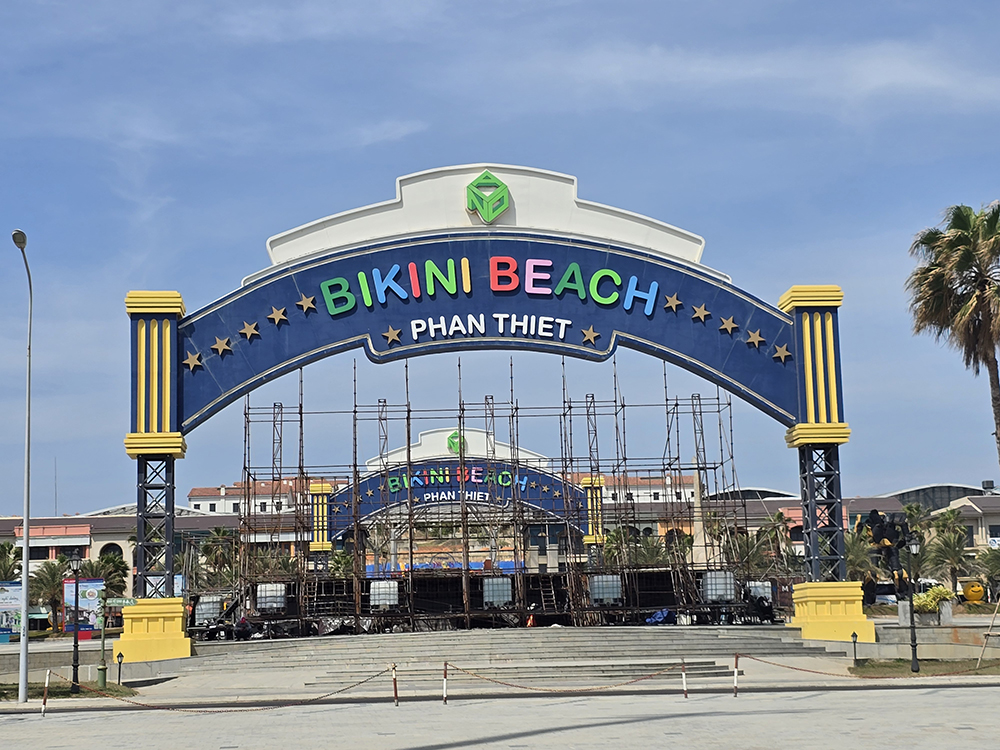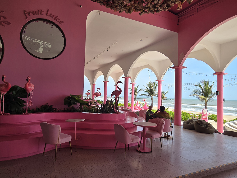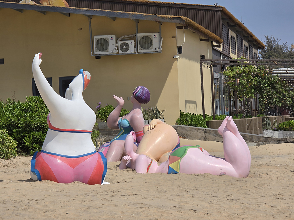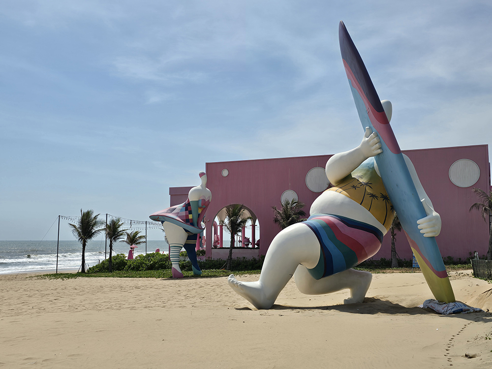 Au sud de Phan Thiet la côte est loin d’être naturelle ! Un bar « Pinky garden » domine la plage Bikini et ses statues géantes de baigneuses. Le tout dominé par des hôtels de luxe gigantesques !