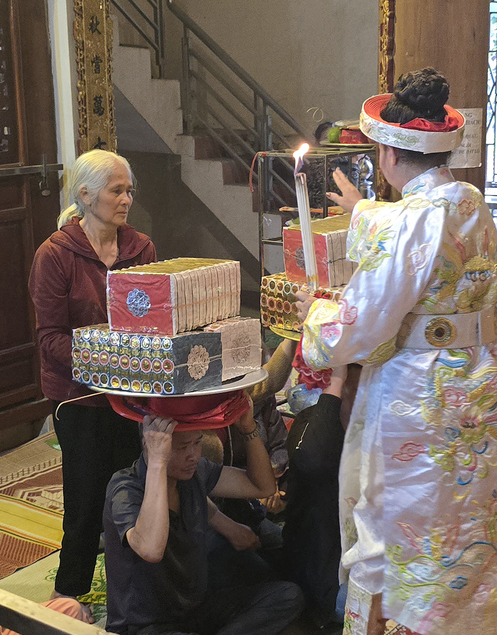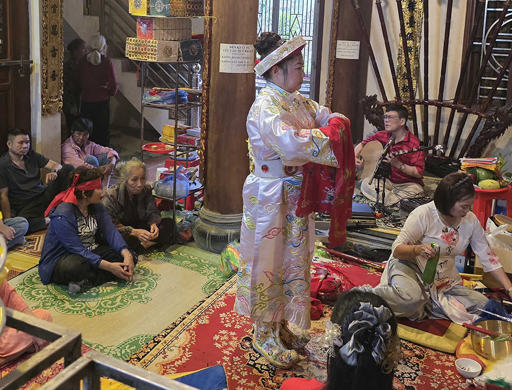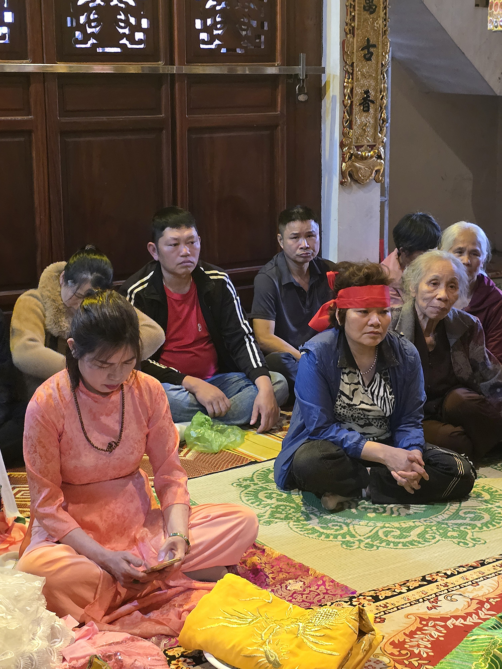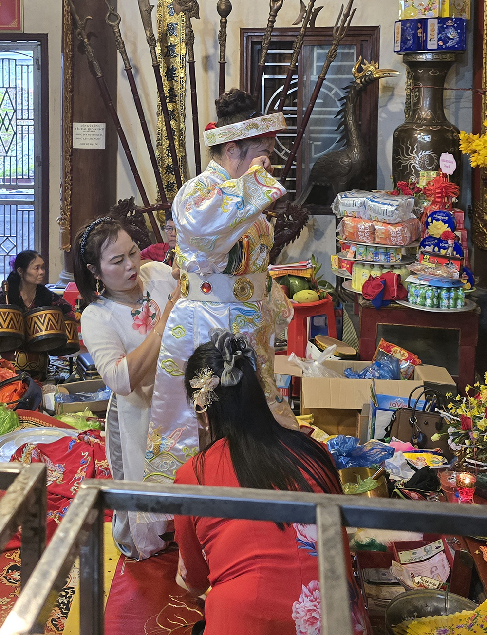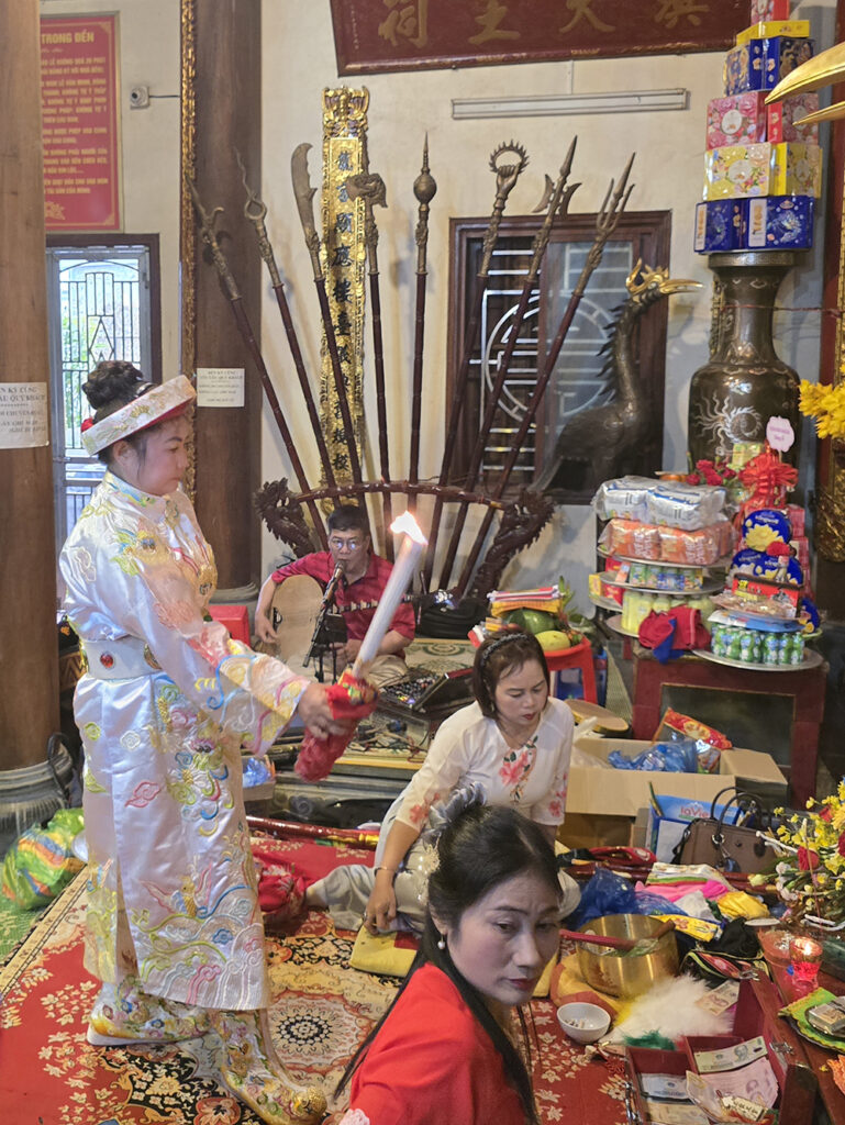 A Lang Son, nous avons eu la chance d’assister à la cérémonie bouddhiste de Hâu Dông. C’est un rituel très intéressant et esthétique qui se passe dans un temple en général. Un médium (souvent une femme) entre en contact avec les divinités et l’esprit de la Déesse-mère pour leur demander leur bénédiction, une bonne santé et beaucoup d’argent. Elle lui fait des offrandes et est accompagnée d’assistants pour l’aider à changer de costume et de maquillage pour chaque rituel, pendant qu’un orchestre joue de la musique. Cette cérémonie dure très longtemps car le médium peut se changer parfois 36 fois. Elle distribue des offrandes au public (gâteaux, bonbons,fruits ou argent) après chaque séquence.