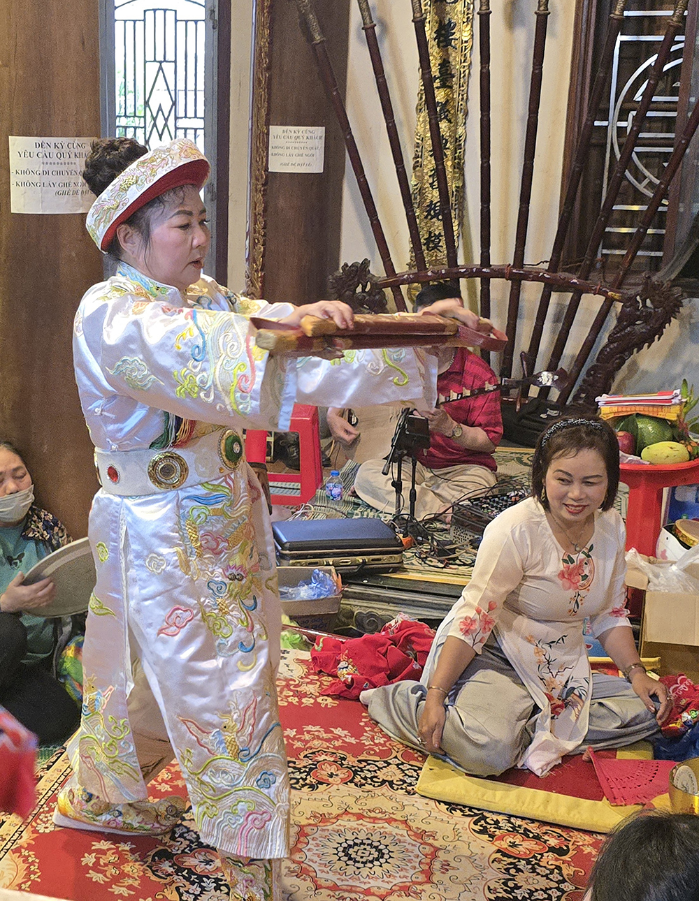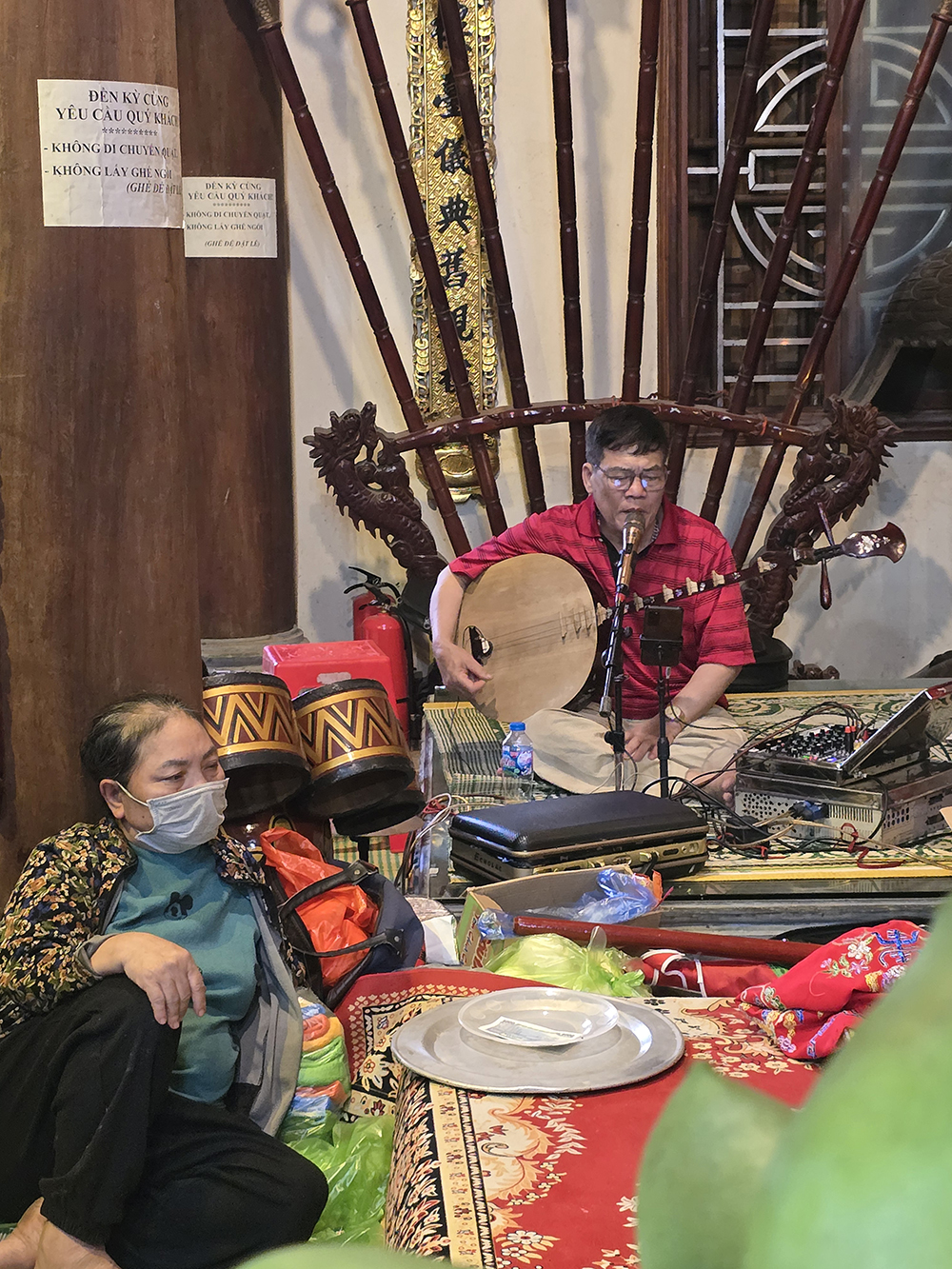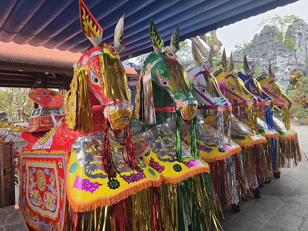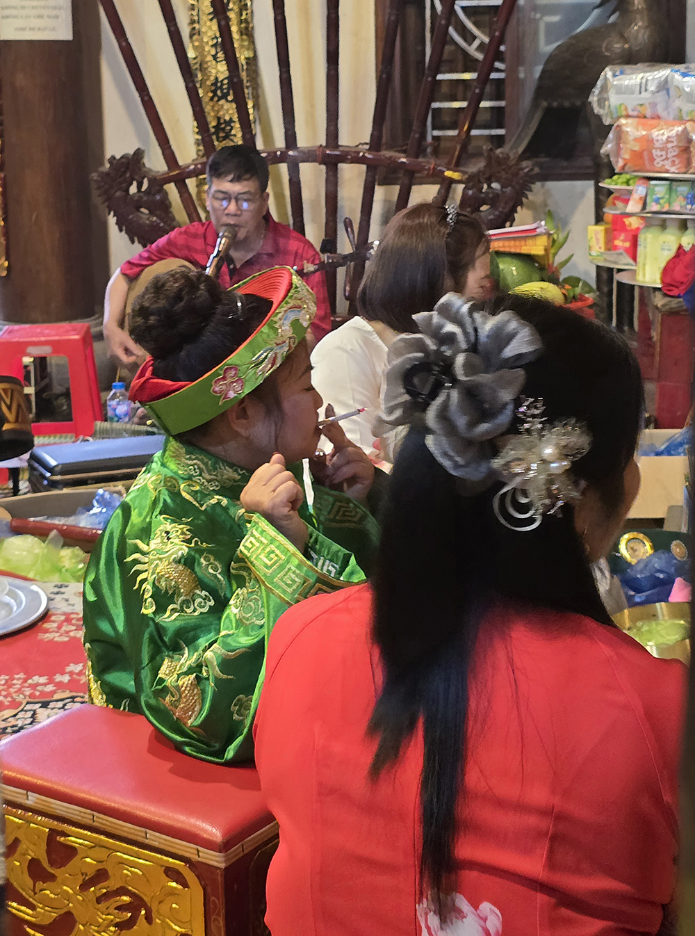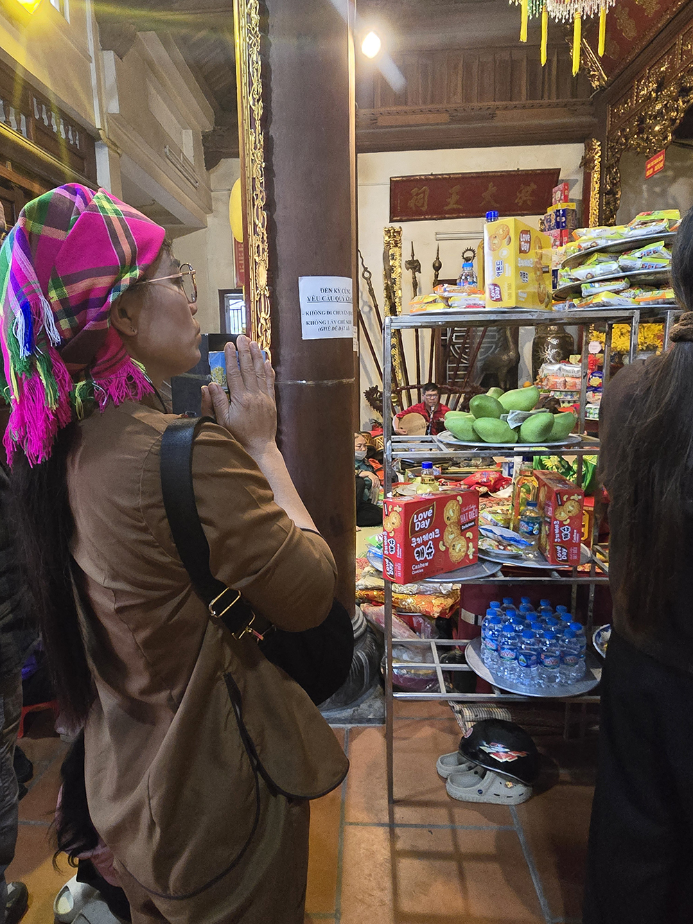 A Lang Son, nous avons eu la chance d’assister à la cérémonie bouddhiste de Hâu Dông. C’est un rituel très intéressant et esthétique qui se passe dans un temple en général. Un médium (souvent une femme) entre en contact avec les divinités et l’esprit de la Déesse-mère pour leur demander leur bénédiction, une bonne santé et beaucoup d’argent. Elle lui fait des offrandes et est accompagnée d’assistants pour l’aider à changer de costume et de maquillage pour chaque rituel, pendant qu’un orchestre joue de la musique. Cette cérémonie dure très longtemps car le médium peut se changer parfois 36 fois. Elle distribue des offrandes au public (gâteaux, bonbons,fruits ou argent) après chaque séquence.