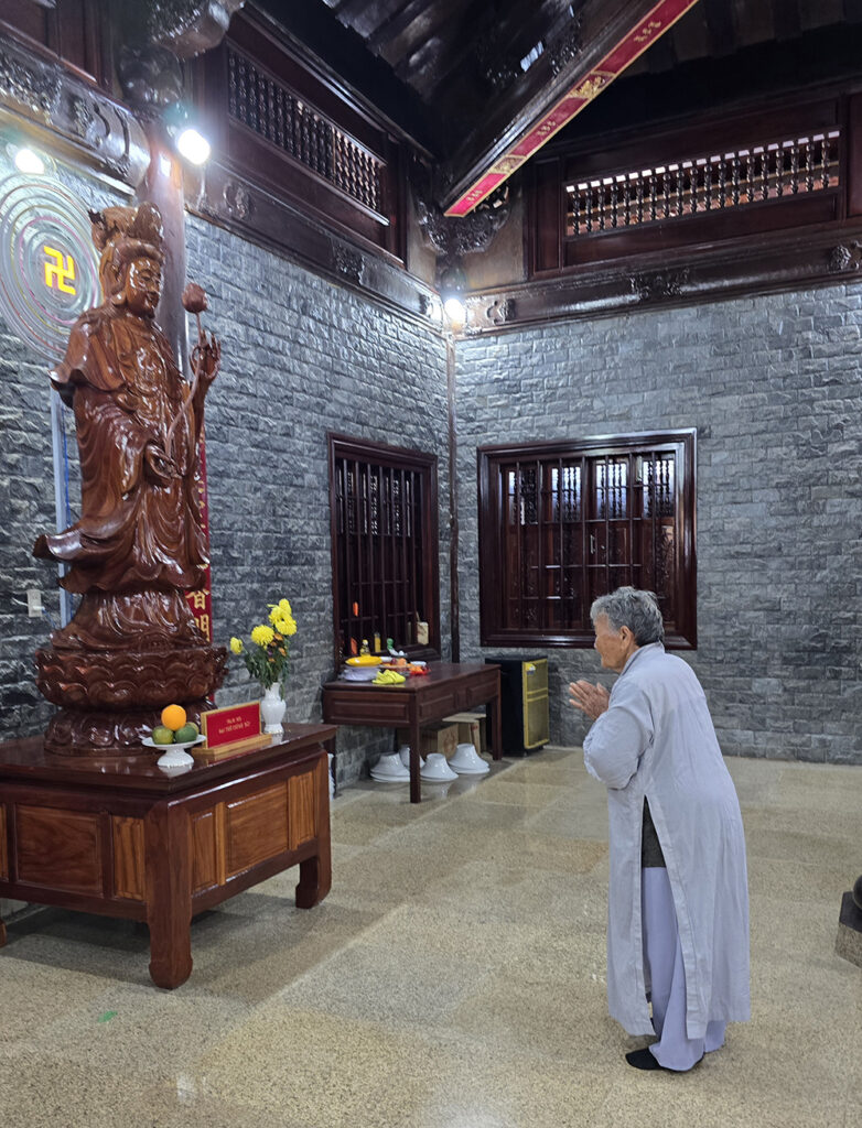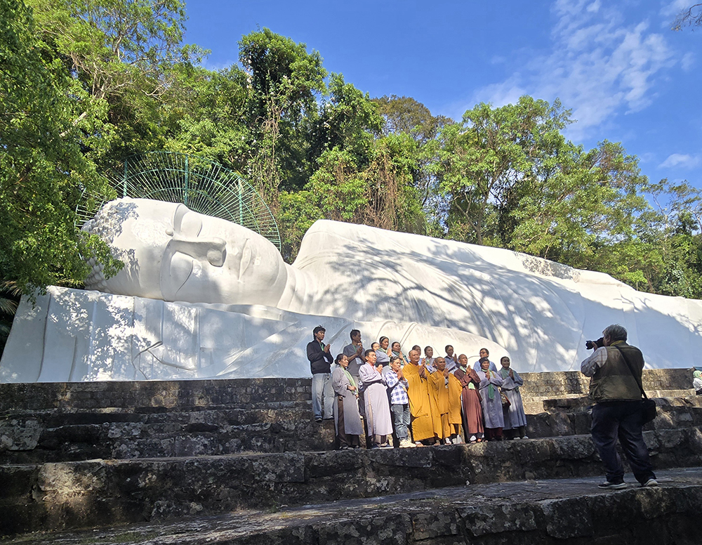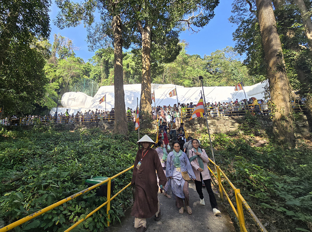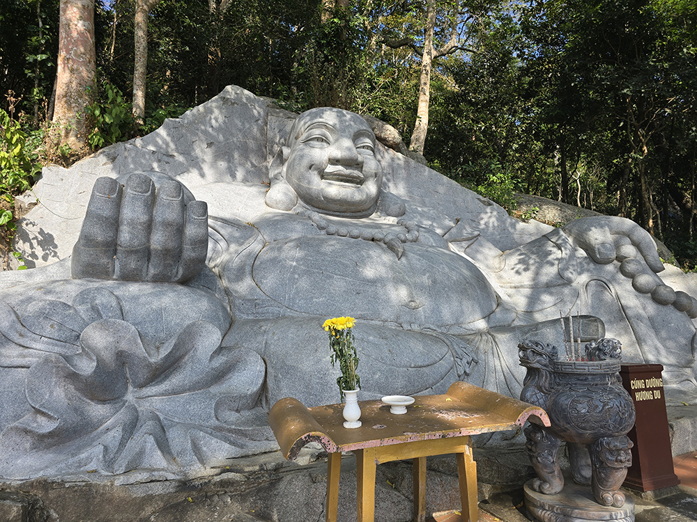 Le plus grand bouddha couché du Vietnam est au sommet de la montagne sainte de Ta Cù. Nous avons eu la chance d’y être en même temps que de nombreux pèlerins venus assister à une cérémonie avec des prêtres. Ils se sont prêtés à des photos souvenirs pour immortaliser l’évênement.