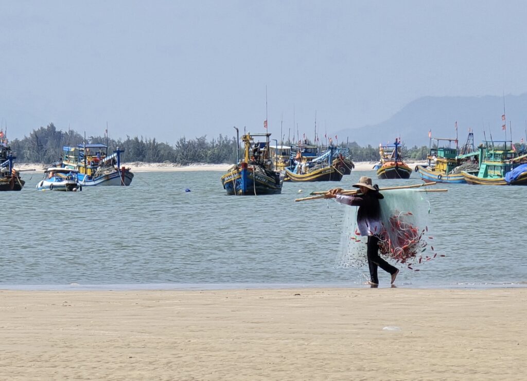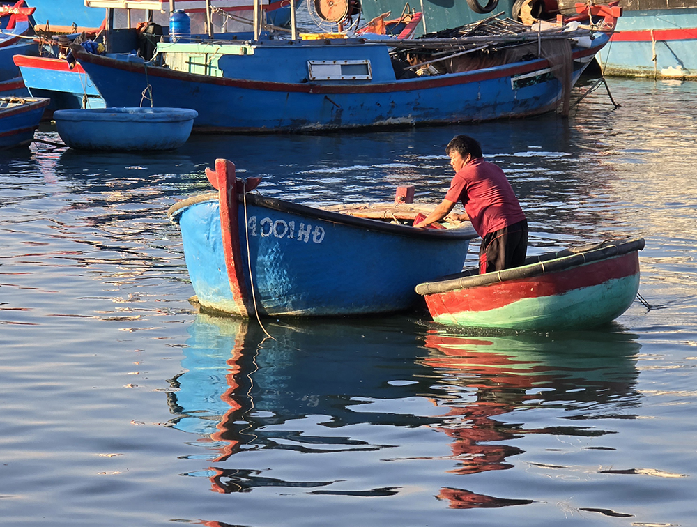 10 février : Il pleut aujourd’hui , nous partons pour Tam Ky en sleeping bus. Arrivée à 15heures et Grab pour Tam Thanh . Installation dans un homestay face à la mer. Balade dans ce petit village de pêcheurs connu pour ses maisons décorées de peintures murales et aussi pour ses bateaux paniers relookés.