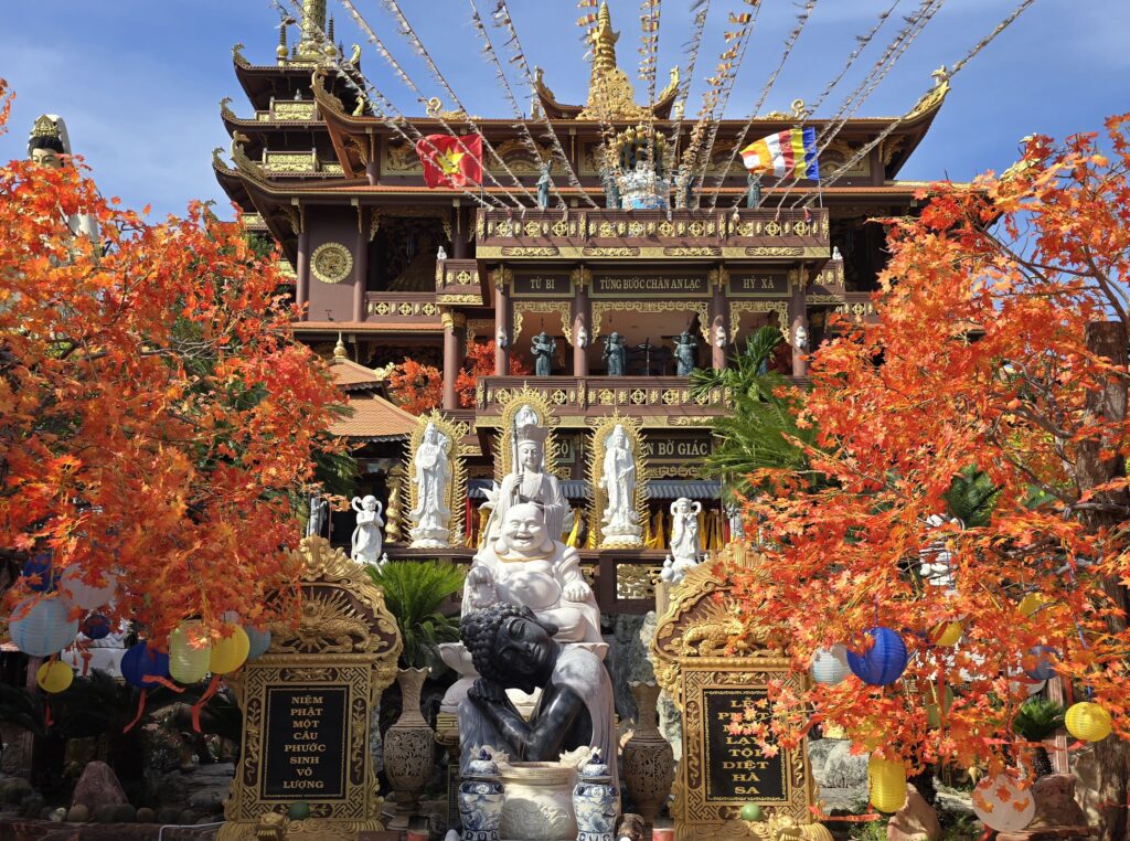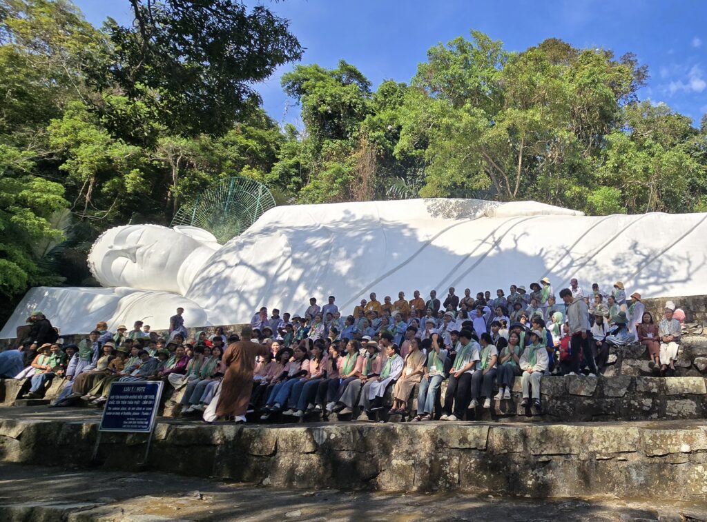 25 janvier : Tour en scooter au sud de Phan Thiet jusqu’au cap Ke Ga. Sur la route du retour, nous prenons un téléphérique pour monter au Mont Ta Cu pour voir le temple bouddhiste et le plus grand bouddha couché du Vietnam. Nous assistons à un service religieux avec de nombreux fidèles qui posent devant le bouddha!