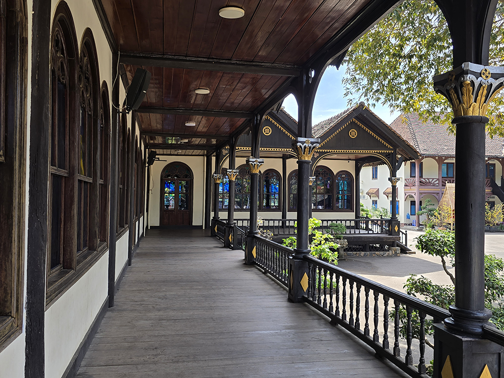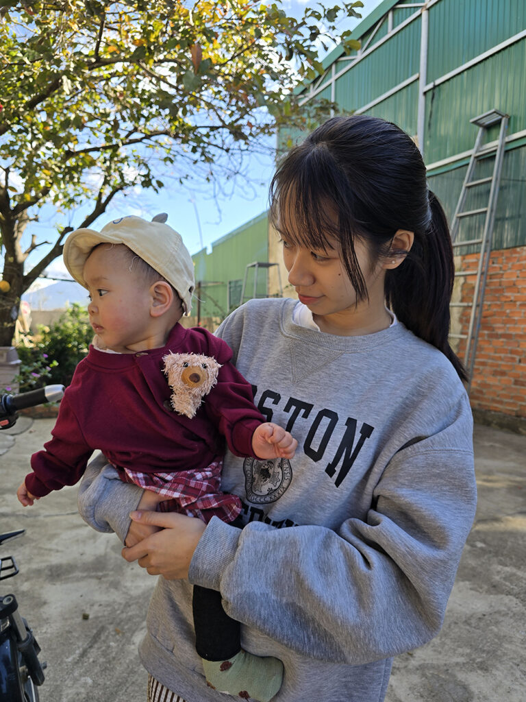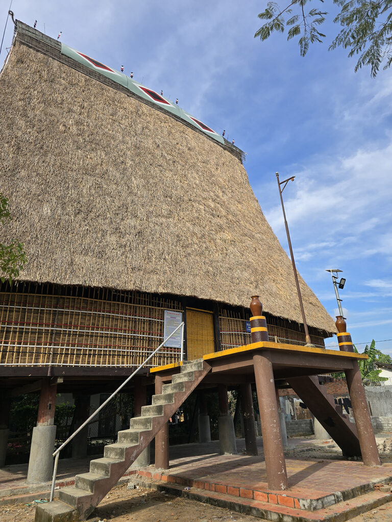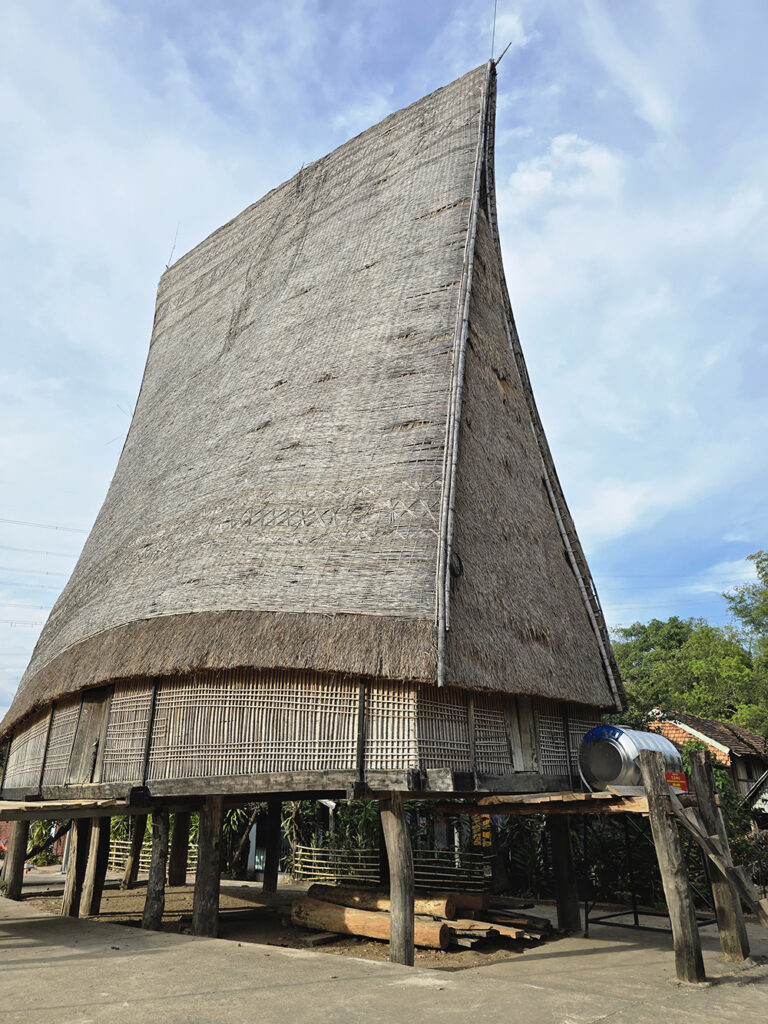 5 février :  Nous partons en bus public pour Kontum. On va voir le le marché et la cathédrale qui est une église en bois magnifique. Nous partons en scooter à l’Est de la ville voir les villages des ethnies Bahnars : Konklor et Kon K’Tu et leur maison communale typique de la région : les « nah rong ». Puis nous visitons la pagode Hué Hurong en ville où les gens jouent au padel dans la cour. Nous dînons dans un restaurant de rue pour finir cette journée bien remplie.