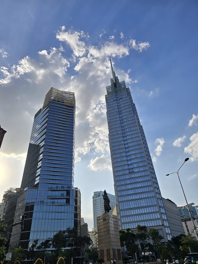 23 Janvier :  Après 11h de vol on arrive à Xiamen en Chine dans la nuit, on y fait une escale de 3h . On atterrit à Ho Chi Minh à midi  heure locale (ici décalage de + 6 heures). On prend un taxi Grab (le Hubert d’Asie) pour aller à notre Hôtel dans le quartier1, très touristique et animé. Fatigués du voyage, on se balade à pieds l’après-midi au bord du Mekong et vers les « Champs-Elysées » de Saïgon. On dîne dans notre rue avant de se coucher tôt : le jetlag se fait sentir cruellement!