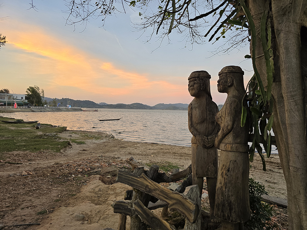 1er  février : Nous partons en scooter faire le tour du lac à la rencontre des habitants qui travaillent dans les rizières et des champs de caféiers en fleurs. Au passage on visite un village Ede traditionnel avec ses nombreuses sculptures en bois, à côté du rocher de l’éléphant. Au hasard des chemins nous sommes amenés à traverser une rivière sur un bac. En rentrant à Lien Son, nous nous arrêtons voir des jeunes qui se livrent à des compétitions sportives dans une école.