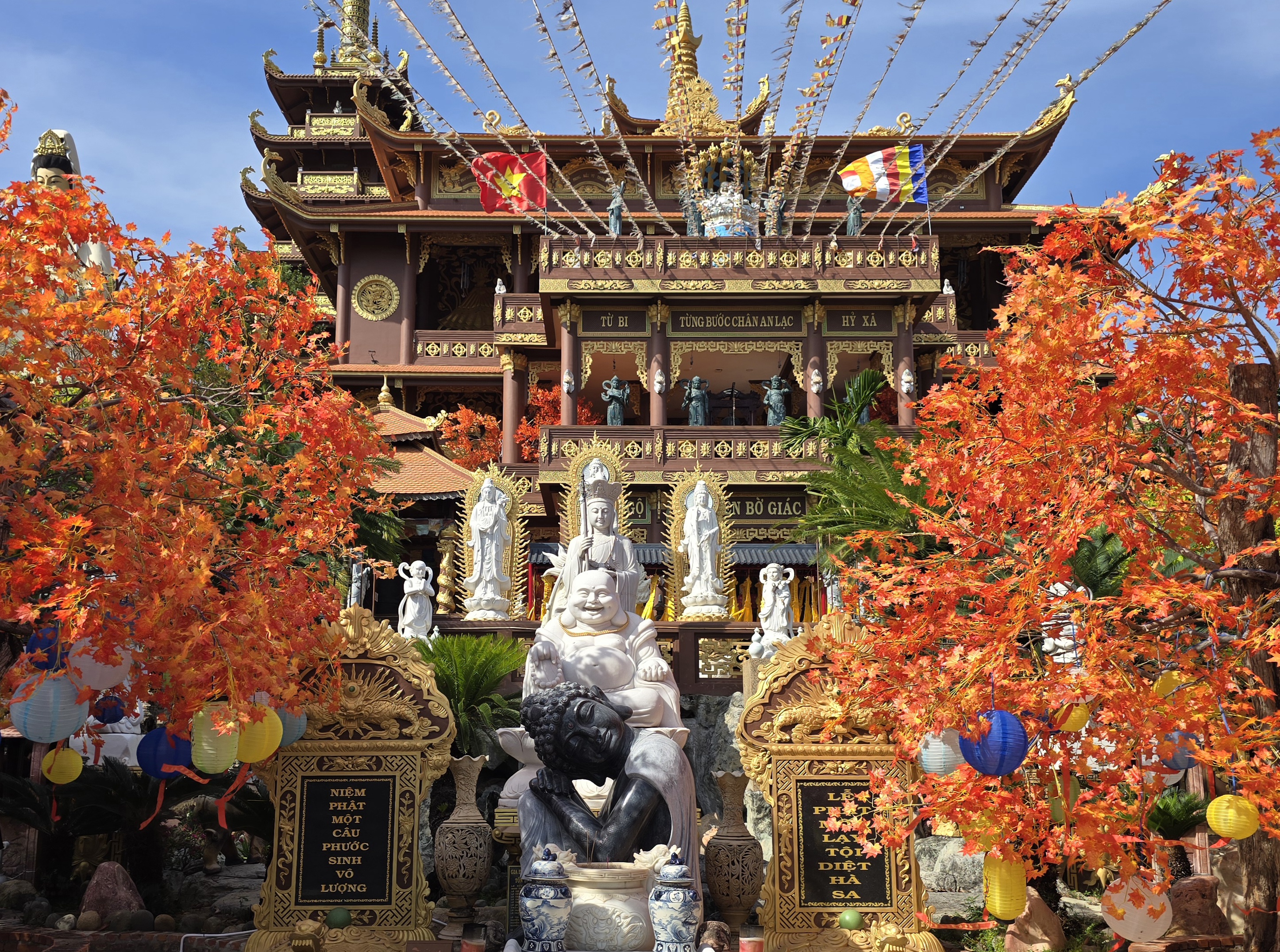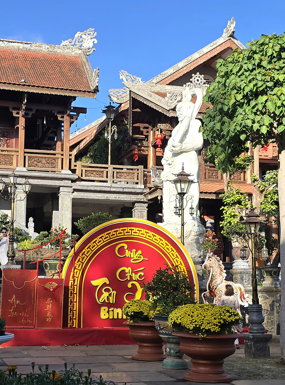 6 février : En scooter nous nous dirigeons vers Dak Tô au Nord en logeant le lac Pô Kô. Les paysages sont magnifiques et embaumés par les fleurs de caféiers. on roule au milieu des cultures d’hévéas et de caféiers. Dans un village nous rencontrons des jeunes qui préparent des stands pour le Têt qui approche.Nous nous arrêtons dans de nombreux villages bahnars pour voir leur « na rong » (ou maison communale). Sur le retour nous apprécions la très belle pagode Hué Chieu au bouddha géant, où les moines travaillent à la décoration du têt.