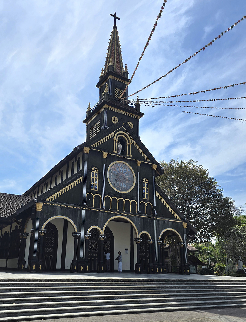 5 février :  Nous partons en bus public pour Kontum. On va voir le le marché et la cathédrale qui est une église en bois magnifique. Nous partons en scooter à l’Est de la ville voir les villages des ethnies Bahnars : Konklor et Kon K’Tu et leur maison communale typique de la région : les « nah rong ». Puis nous visitons la pagode Hué Hurong en ville où les gens jouent au padel dans la cour. Nous dînons dans un restaurant de rue pour finir cette journée bien remplie.